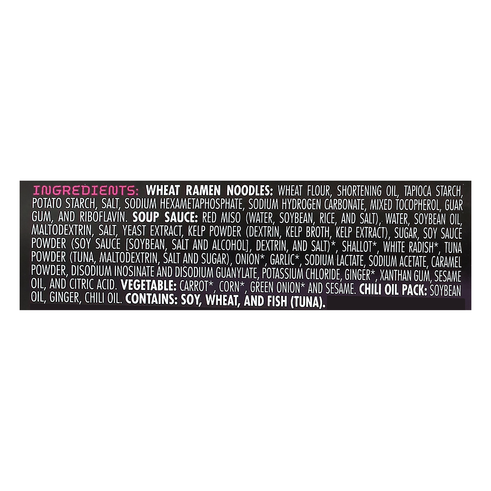 Wheat ramen noodles: wheat flour, shortening oil, tapioca starch, potato starch, salt, sodium hexametaphosphate, sodium hydrogen carbonate, mixed tocopherol, guar gum, riboflavin. Soup base: red miso (soybean, rice, salt, alcohol), water, soybean oil, maltodextrin, salt, yeast extract, sugar, soy sauce powder (soy sauce [soybean, salt, alcohol], dextrin, salt), white radish, shallot, onion, tuna powder (tuna, maltodextrin, salt, sugar), garlic, caramel, miso powder.