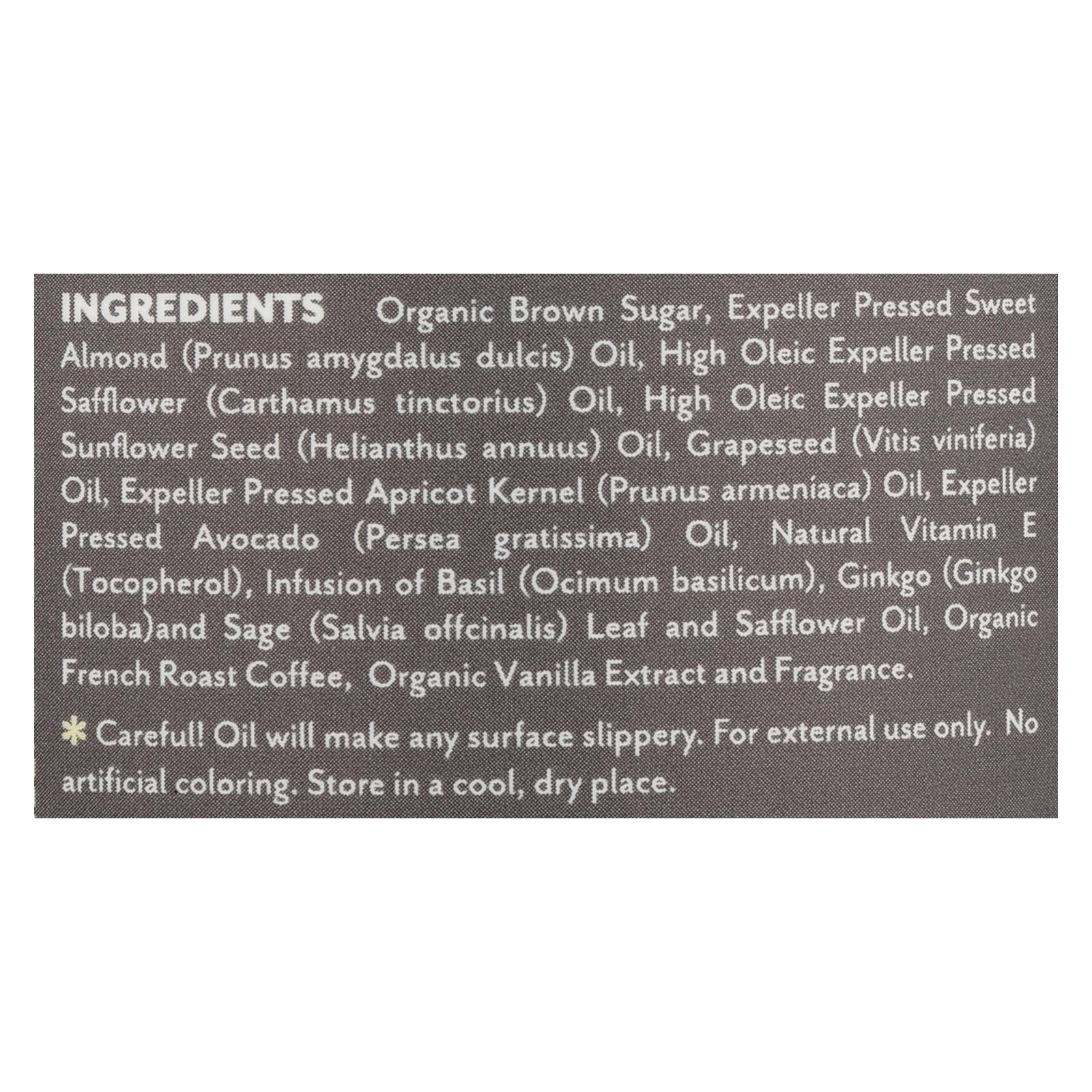 Organic brown sugar, expeller pressed sweet almond (Prunus amygdalus dulcis) oil, high oleic expeller pressed safflower (Carthamus tinctorius) oil, high oleic expeller pressed sunflower seed (Helianthus annuus) oil, grapeseed (Vitis viniferia) oil, expeller pressed apricot kernel (Prunus armeniaca) oil, expeller pressed avocado (Persea gratissima) oil, natural vitamin E (tocopherol), infusion of basil (Ocimum basilicum), ginkgo (Ginkgo biloba) and sage (Salvia officinalis) leaf and safflower oil, organic French roast coffee, vanilla extract.