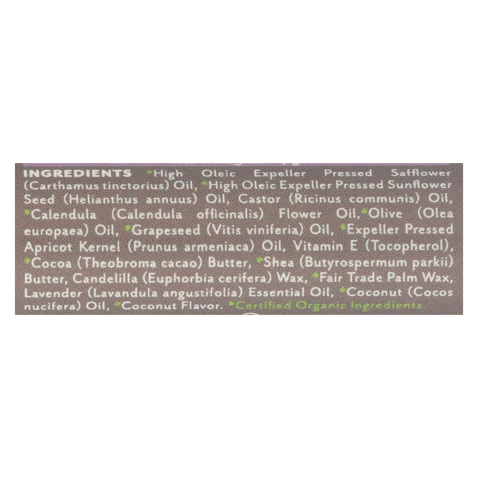 High oleic expeller pressed safflower (Carthamus tinctorius) oil, high oleic expeller pressed sunflower seed (Helianthus annuus) oil, castor (Ricinus communis), calendula (Calendula officinalis) flower oil, olive (Olea europaea), grapeseed (Vitis viniferia), expeller pressed apricot kernel (Prunus armeniaca), vitamin E (tocopherol), cocoa (Theobroma cacao) butter, shea (Butyrospermum parkii), candelilla (Euphorbia cerifera) wax, fair trade palm wax, lavender (Lavandula angustifolia) essential oil, coconut (Cocos nucifera), coconut flavor.