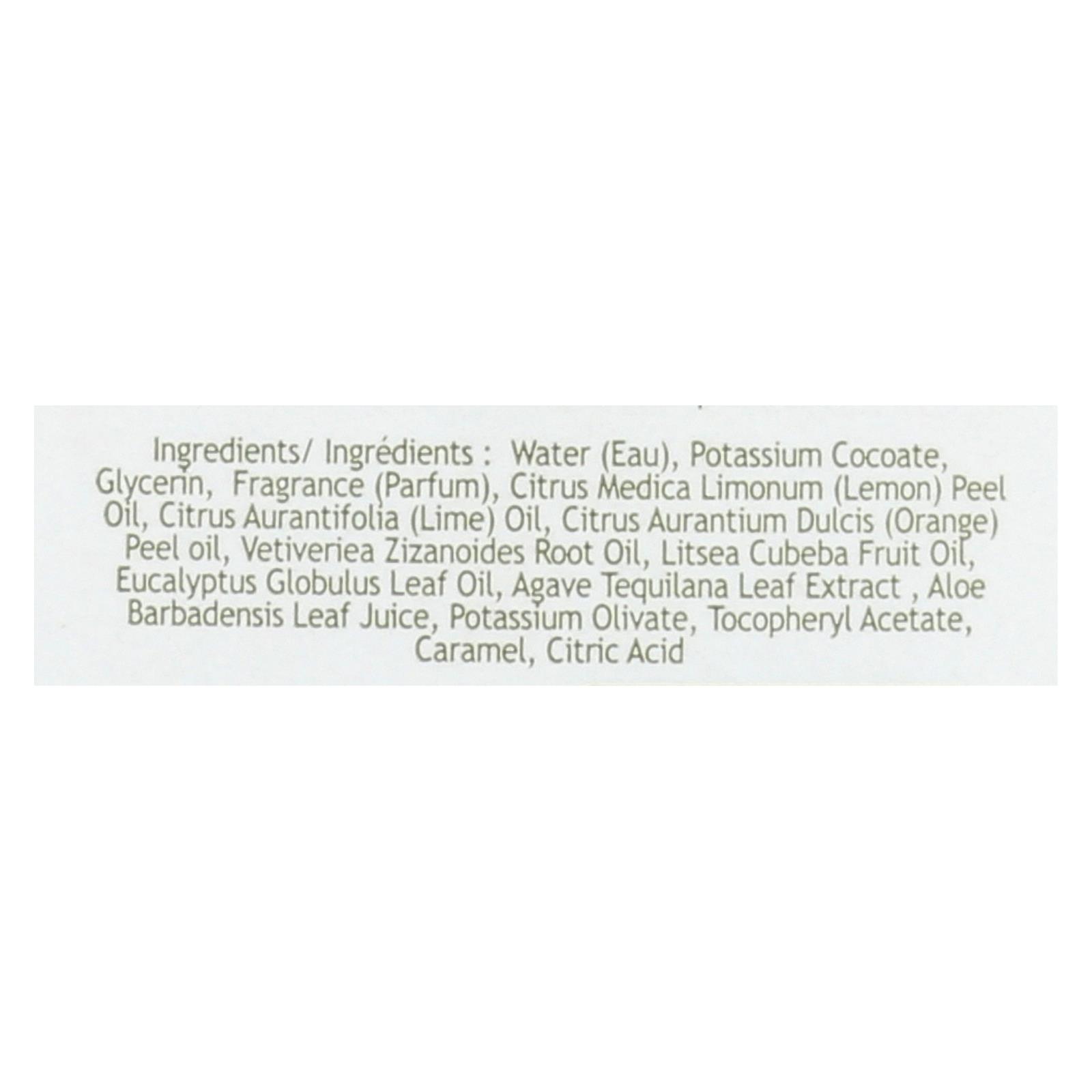 Water, potassium cocoate, glycerin, fragrance, citrus medica limonum (lemon) peel oil, citrus aurantifolia (lime) oil, citrus aurantium dulcis (orange) oil, vetiveria zizanoides root oil, litsea cubeba fruit oil, eucalyptus globulus leaf oil, agave tequilana leaf extract, aloe barbadensis leaf juice, potassium olivate, tocopheryl acetate, caramel, citric acid.