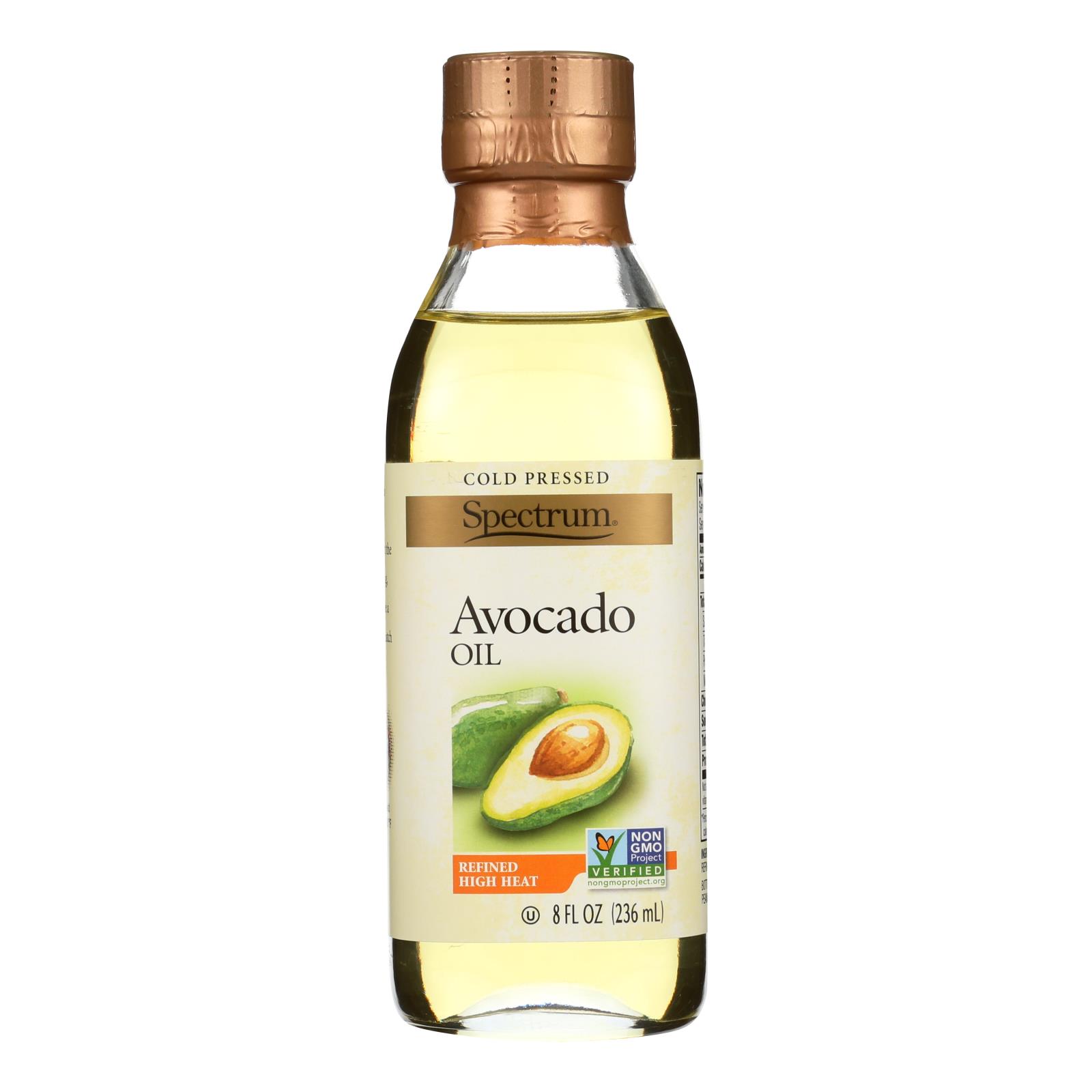 Spectrum naturals cold pressed avocado oil is a high heat wonder with stores of monounsaturated fat. We extract the oil from the fruit by cold pressing, then gently refine it to create a clean, fresh oil that is a perfect match for any high-heat cooking. Certified kosher and non-gmo, this oil is best for high-heat applications such as sauteing, frying and all-purpose cooking. Includes one 8 oz. Bottle of spectrum naturals cold pressed avocado oil.