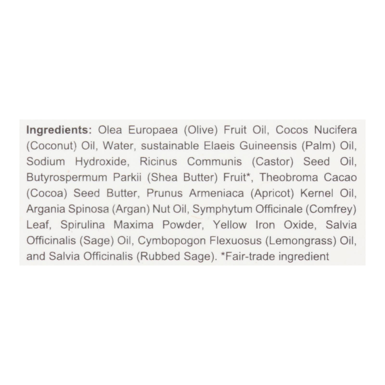 ingredients : olea europaea (olive) fruit oil;cocos nucifera (coconut) oil;water;sustainable elaeis guineensis (palm) oil;sodium hydroxide;ricinus communis (castor) seed oil;butyrospermum parkii (shea butter) fruit;theobroma cacao (cocoa) seed butter;prunus armeniaca (apricot) kernel oil;argania spinosa (argan) nut oil;symphytum officinale (comfrey) leaf;spirulina maxima powder;yellow iron oxide;salvia officinalis (sage) oil;cymbopogon flexuosus (lemongrass) oil;and salvia officinalis (rubbed sage)