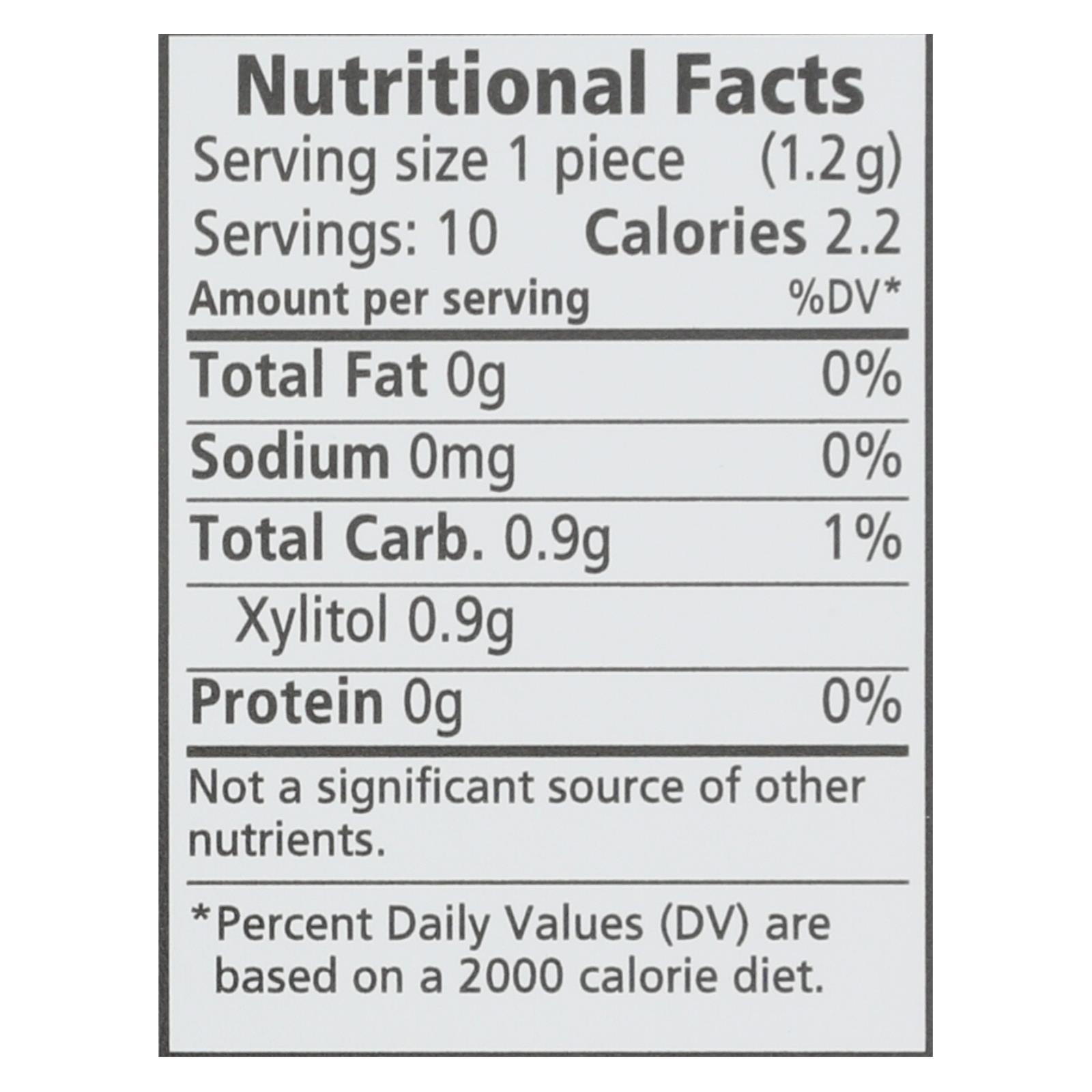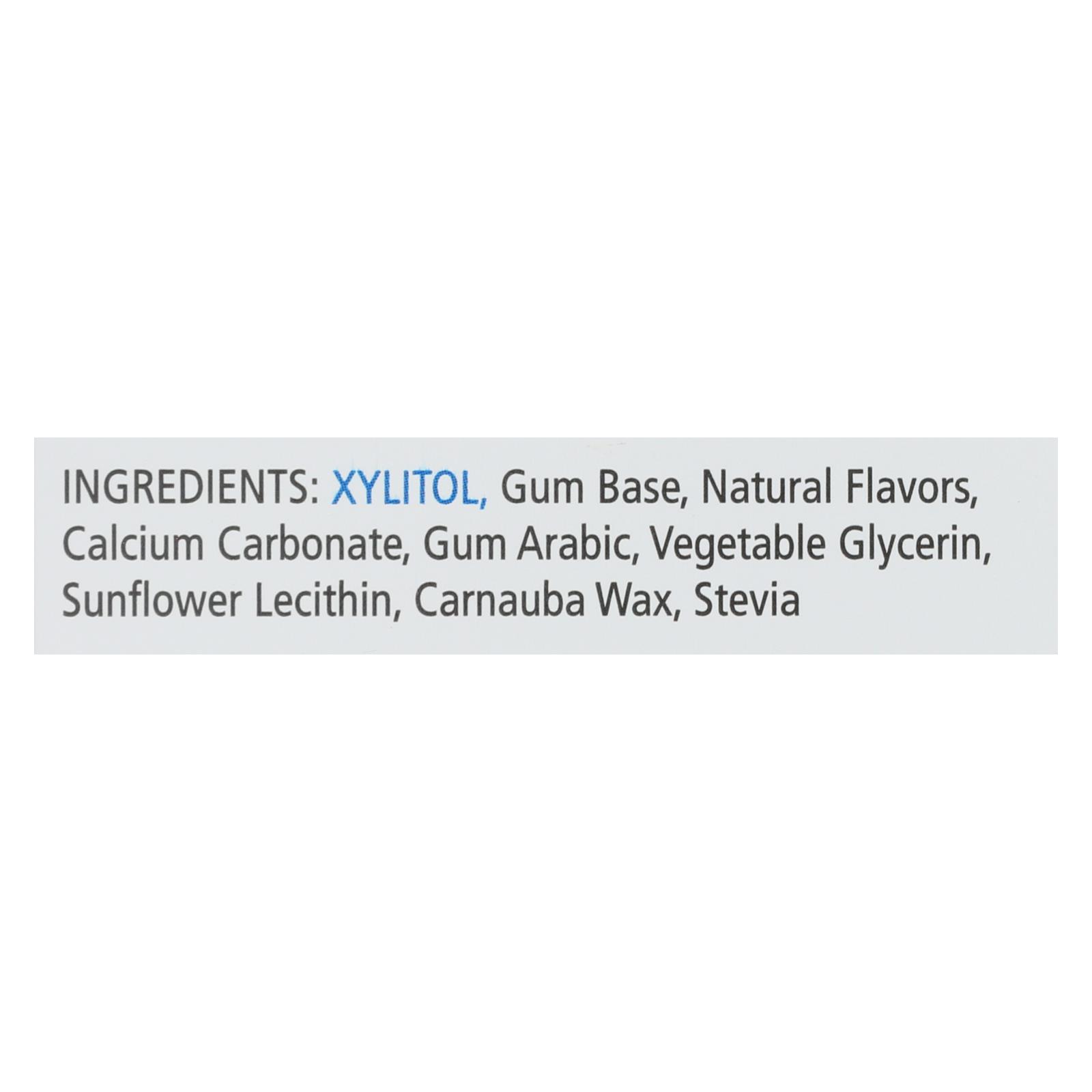 ingredients : xylitol;gum base;natural flavors;calcium carbonate;gum arabic;vegetable glycerin;sunflower lecithin;carnauba wax;stevia
