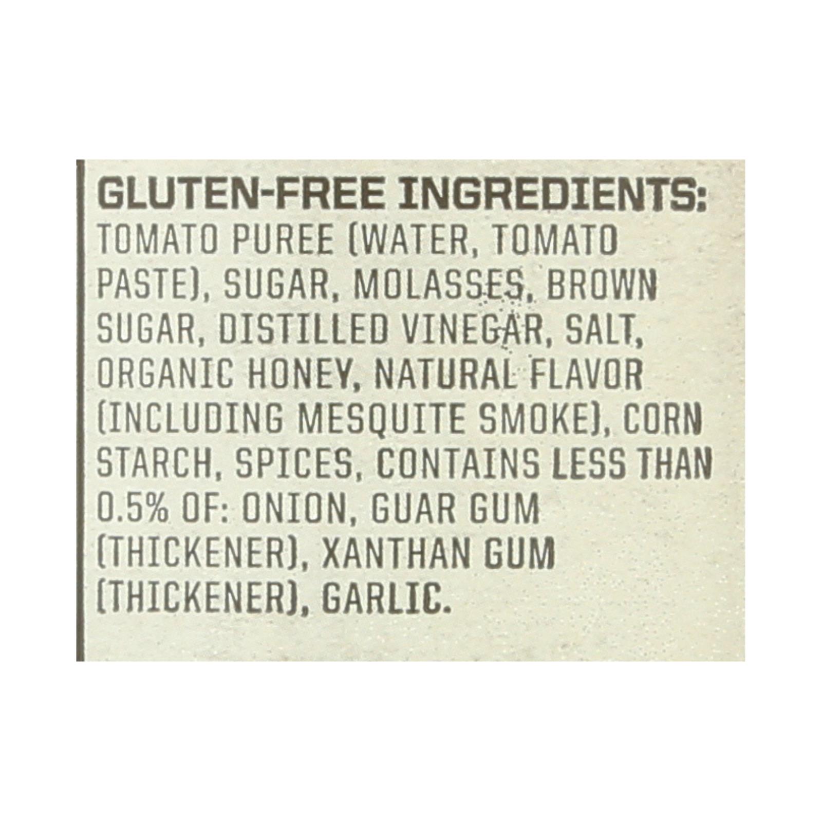 ingredients : gluten-free tomato puree [water, tomato paste];sugar;molasses;brown sugar;distilled vinegar;salt;organic honey;natural flavor [including mesquite smoke];corn starch;spices;contains less than 0;5% of: onion, guar gum [thickener], xanthan gum [thickener], garlic