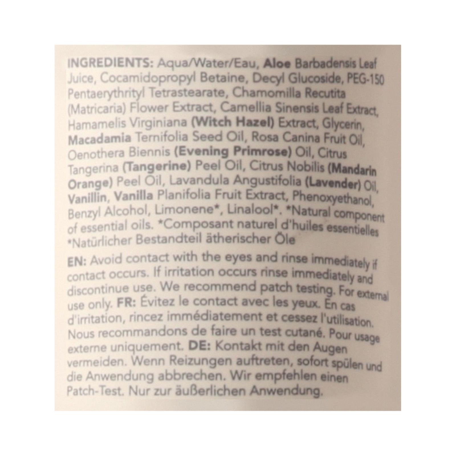 Chamomile, aloe vera, witch hazel, green tea, macadamia oil, evening primrose oil. Free from sulphates, parabens, sodium lauryl sulphate (SLS), sodium laureth sulphate (SLES), synthetic fragrances, animal derivatives, harsh detergents, propylene glycol, artificial colours, triethanolamine, mineral oils, EDTA. 100% vegan. 100% carbon neutral.