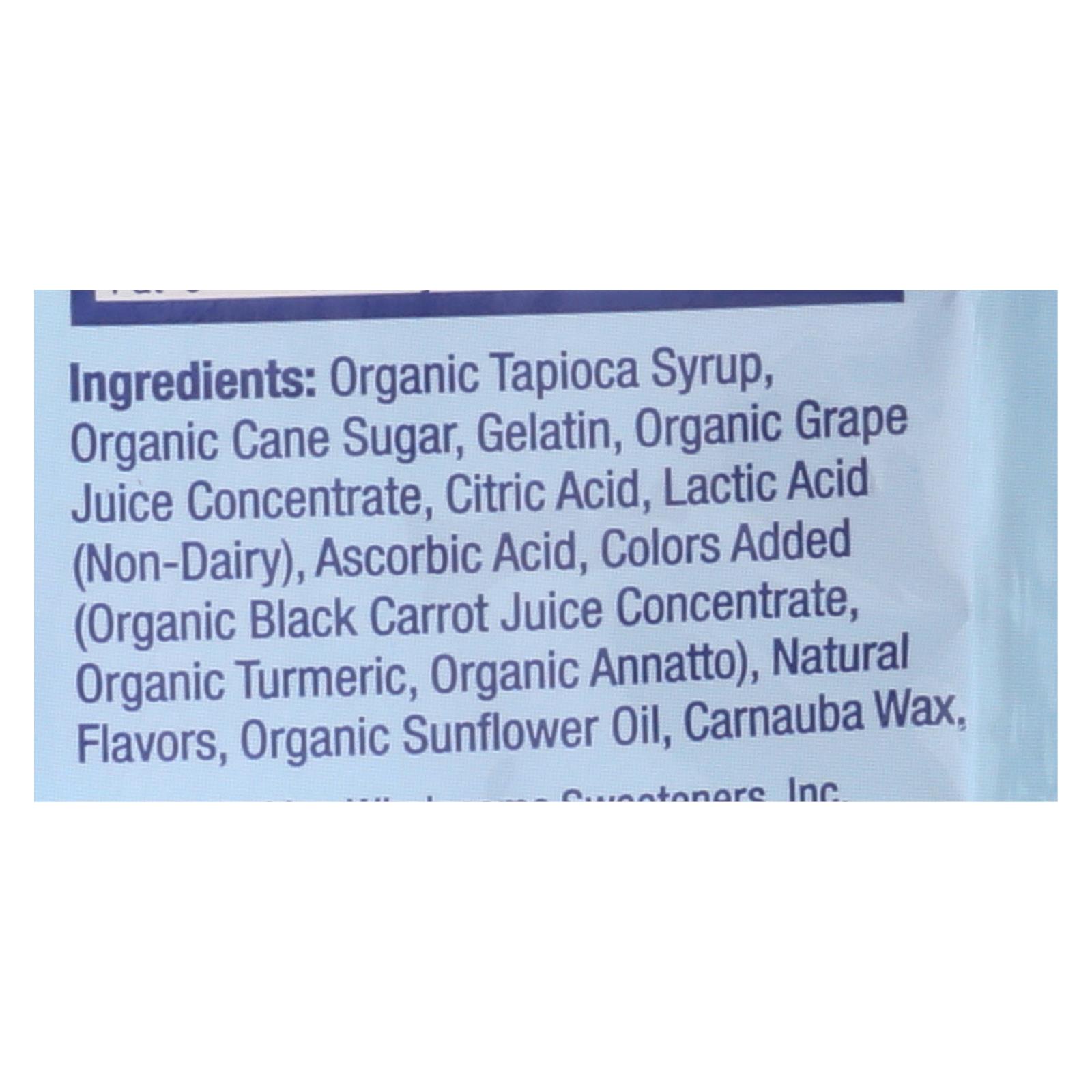 Organic tapioca syrup, organic cane sugar, gelatin, organic grape juice concentrate, citric acid, lactic acid (non-dairy), ascorbic acid, colors added (organic black carrot juice concentrate, organic turmeric, organic annatto), natural flavors, organic sunflower oil, carnauba wax.