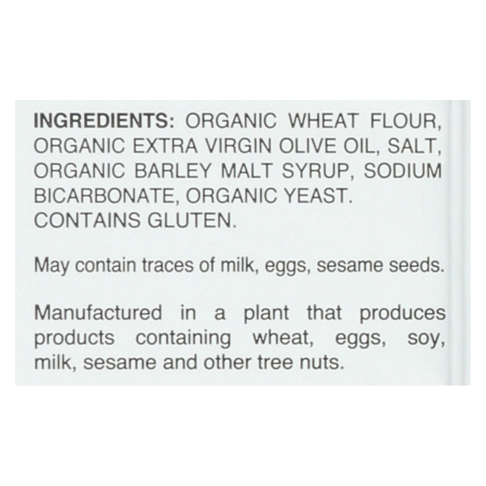 Organic wheat flour, organic extra virgin olive oil, salt, organic barley malt syrup, sodium bicarbonate, organic yeast.