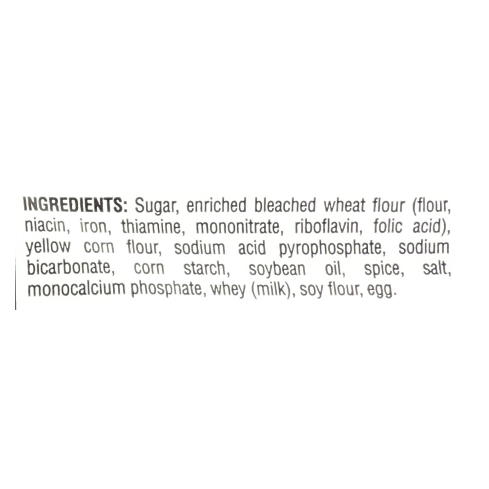 Sugar, enriched bleached wheat flour (flour, niacin, iron, thiamine mononitrate, riboflavin, folic acid), yellow corn flour, sodium acid pyrophosphate, sodium bicarbonate, corn starch, soybean oil, spice, salt, monocalcium phosphate, whey, milk, soy flour, egg.