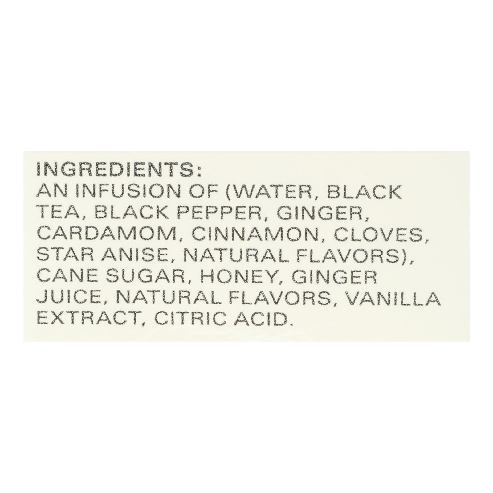 Black tea concentrate, cinnamon, ginger, cardamom, vanilla, sweetener.
