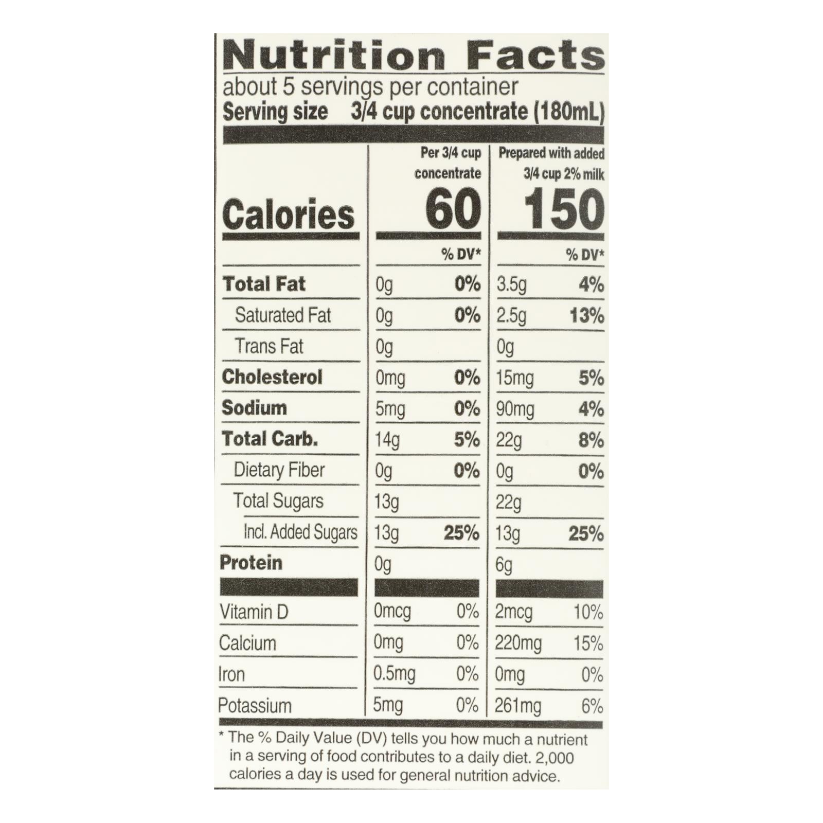 - Serving size: 3/4 cup concentrate (60 calories per serving)