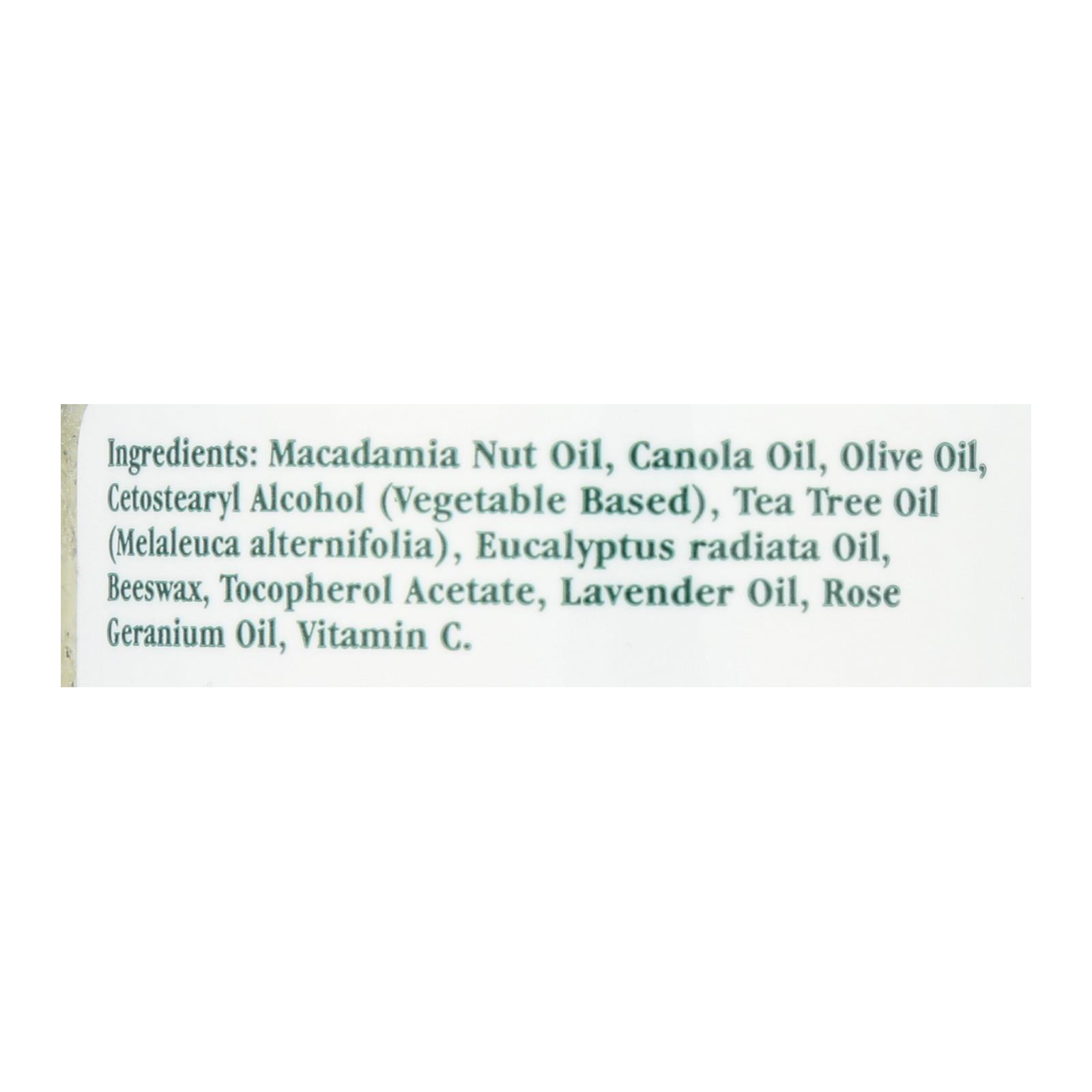 Macadamia nut oil, canola oil, olive oil, cetostearyl alcohol (vegetable based), tea tree oil (melaleuca alternifolia), eucalyptus radiata oil, beeswax, tocopherol acetate, lavender oil, rose geranium oil, vitamin C.