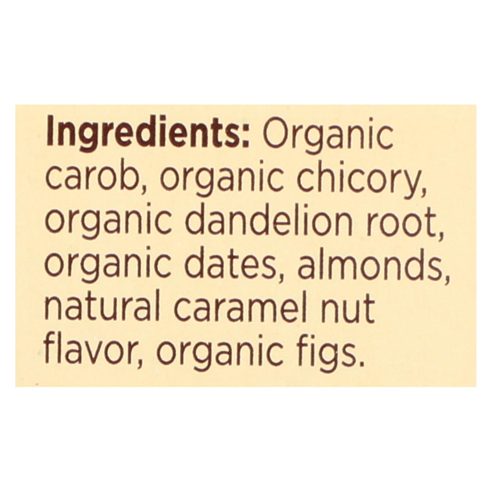 ingredients : organic carob;organic chicory;organic dandelion root;organic dates;almonds;organic figs;natural caramel nut flavor