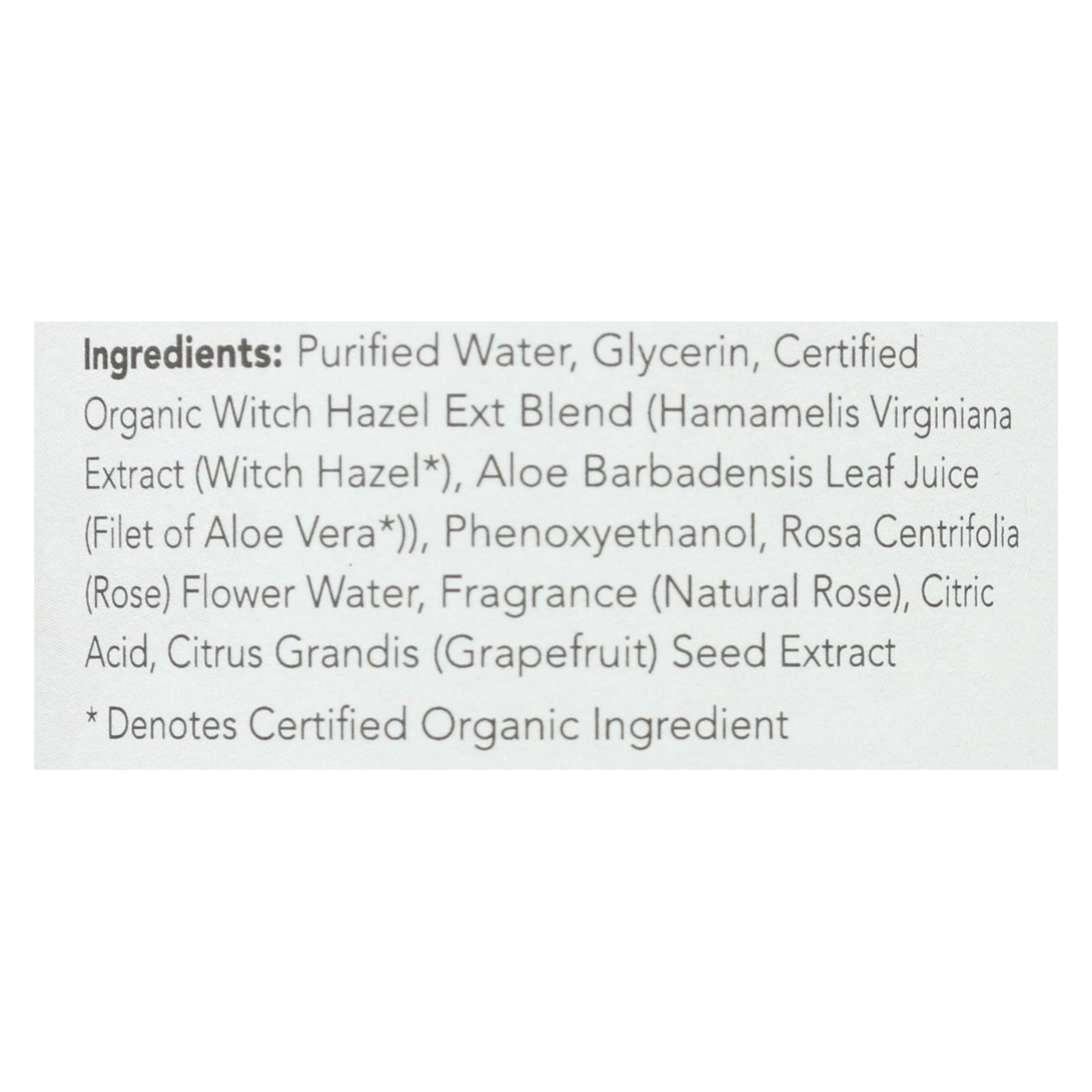 ingredients : purified water;glycerin;certified organic witch hazel ext blend;hamamelis virginiana extract;witch hazel;aloe barbadensis leaf juice;filet of aloe vera;phenoxyethanol;rosa centifolia;rose;flower water;fragrance;natural rose;citric acid;citrus grandis;grapefruit;seed extract