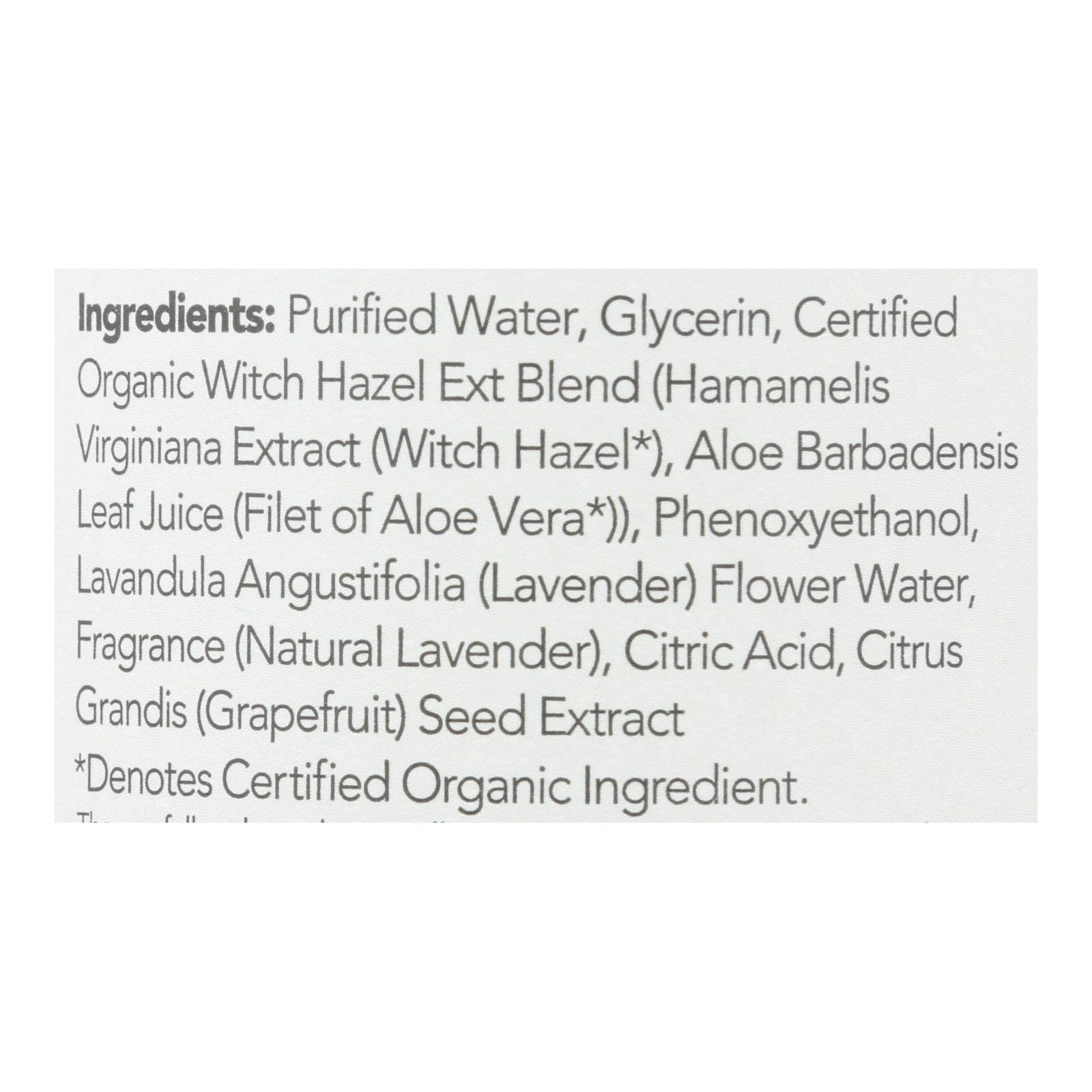 ingredients : purified water;glycerin;certified organic witch hazel ext blend (hamamelis virginiana extract (witch hazel*), aloe barbadensis leaf juice (filet of aloe vera*));phenoxyethanol;lavandula angustifolia (lavender) flower water;fragrance (natural lavender);citric acid;citrus grandis (grapefruit) seed extract