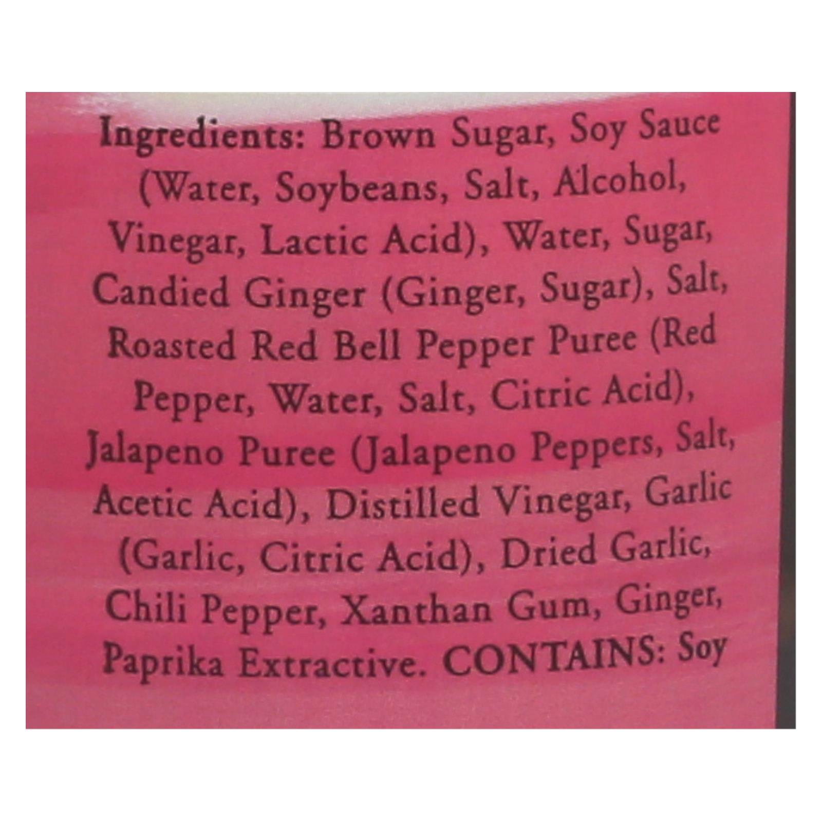 ingredients : brown sugar;soy sauce (water soybeans, salt, alcohol, vinegar, lactic acid);water;sugar;candied ginger (ginger, sugar);salt;roasted red bell pepper puree (red pepper, water, salt, citric acid);jalapeno puree (jalapeno peppers, salt, acetic acid);distilled vinegar;garlic (garlic, citric acid);dried garlic;chili pepper;xanthan gum;ginger;paprika extractive