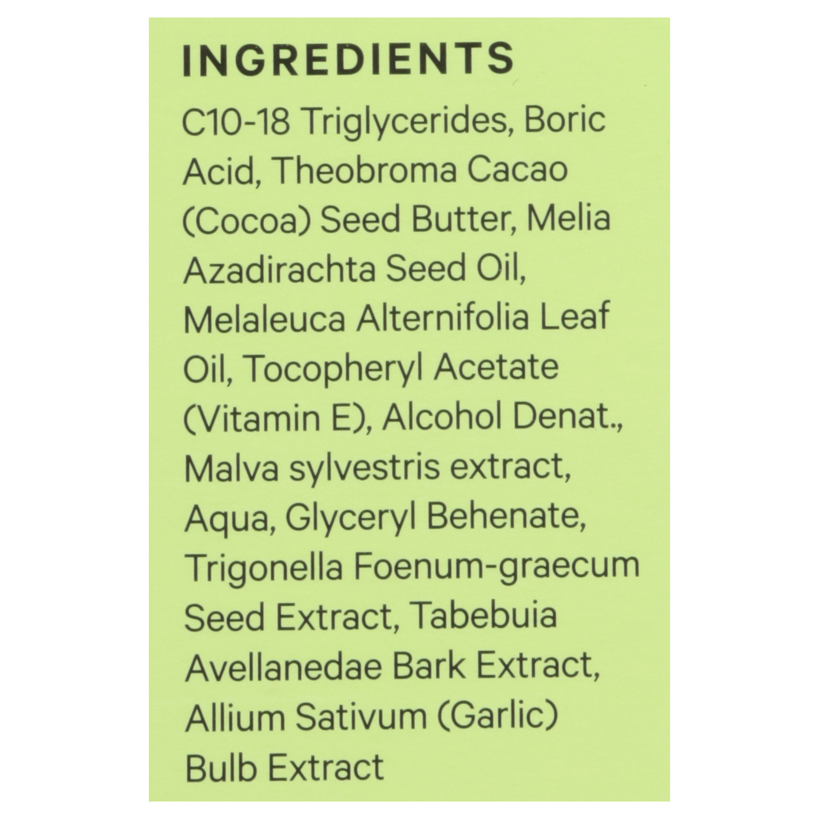 Boric acid, cocoa butter, tea tree oil.
