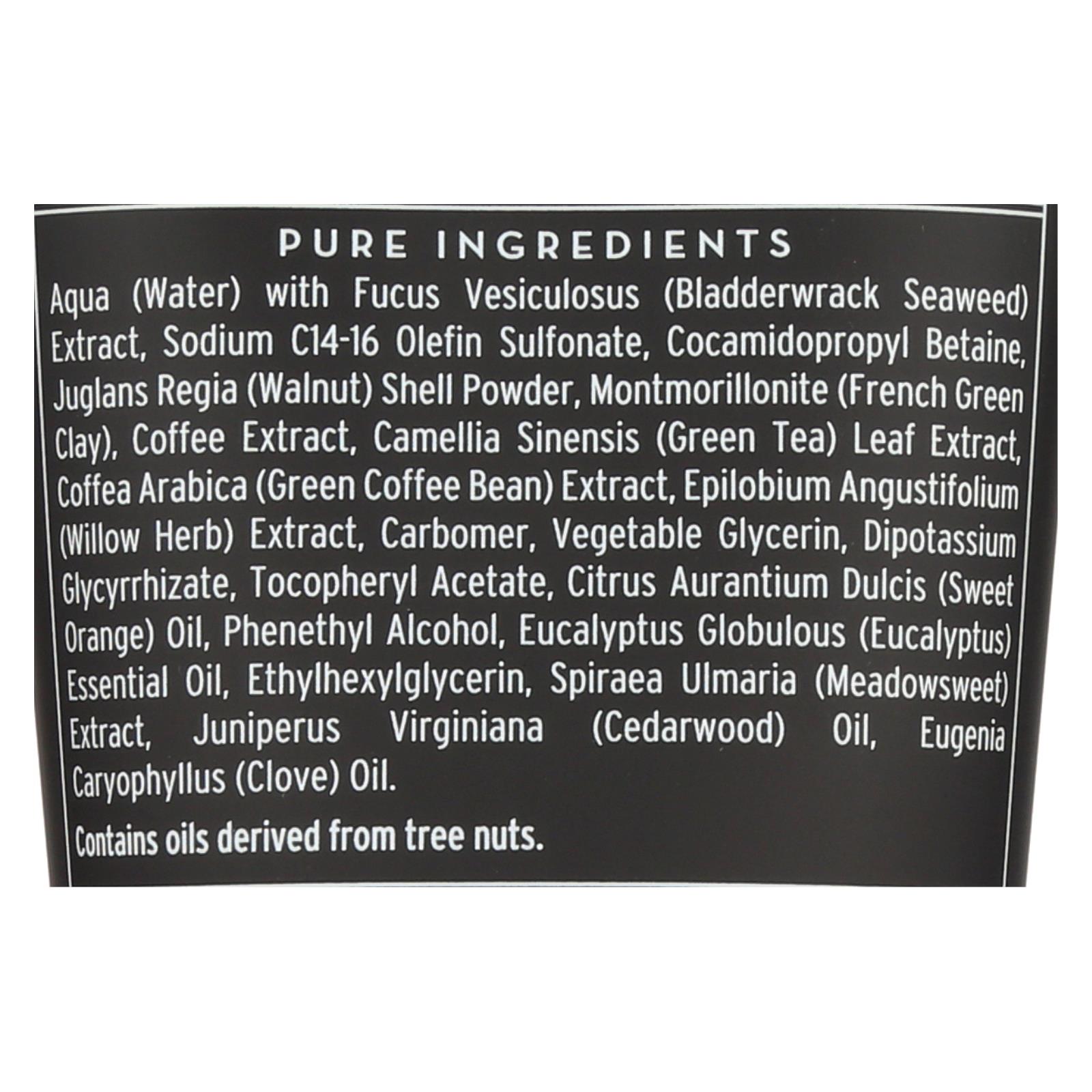 Aqua (water), Fucus vesiculosus (bladderwrack seaweed) extract, Chlorella vulgaris extract, Juglans regia (walnut) shell powder, glycerin, cocamidopropyl betaine, sodium C14-16 olefin sulfonate, phenethyl alcohol, ethylhexylglycerin, triethyl citrate, Citrus aurantium dulcis (orange) oil, linalyl acetate, linalool, Juniperus virginiana (cedarwood), Eugenia caryophyllus (clove), gamma decalactone, aldehyde C-18, ionone beta, hexenol cis-3, hexenyl acetate cis-3, melon aldehyde, citronellol, phenyl ethyl acetate, Eucalyptus globulus.