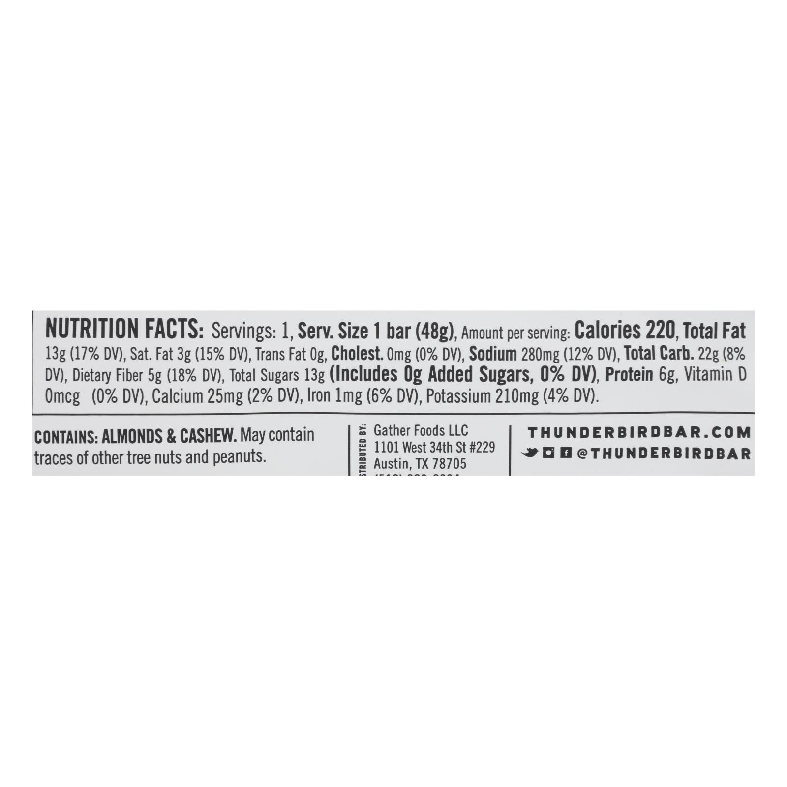 Thunderbird Bar Chocolate Almond Butter Sea Salt is a 1.7 oz gluten-free, paleo, vegan snack with no added sugar, crafted in Austin, Texas. Case of 12