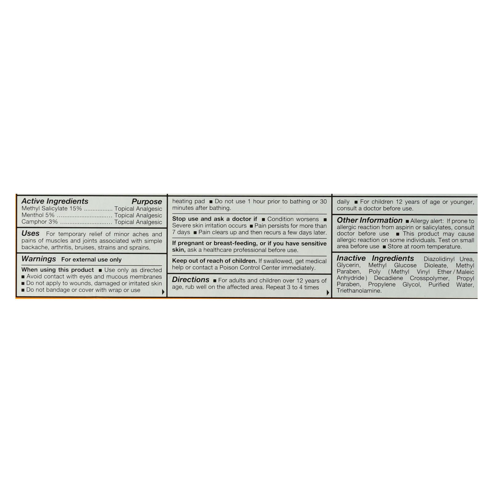 Active: Methyl salicylate 15%, Menthol 5%, Camphor 3%