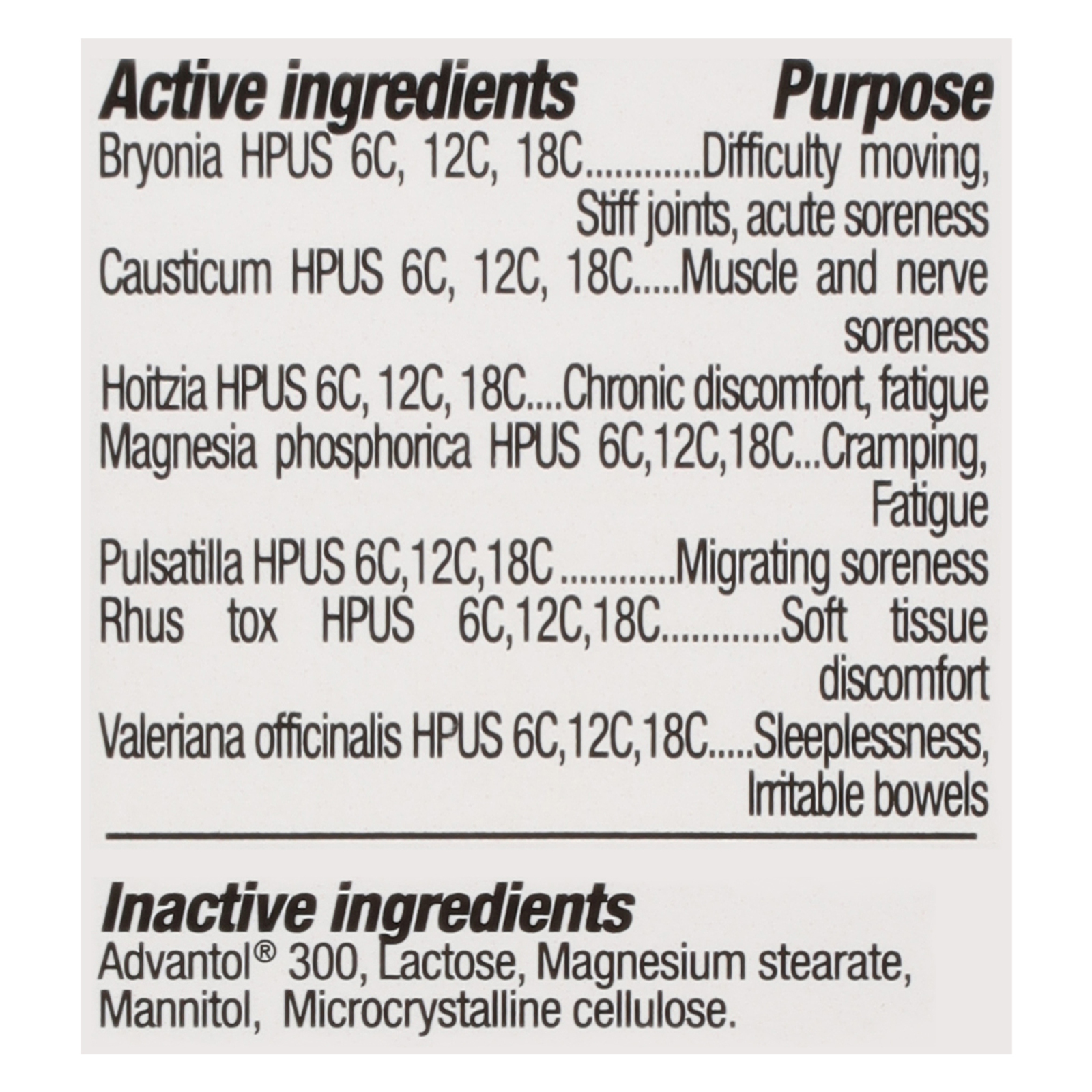 Micro-diluted active ingredients (in accordance with the Homeopathic Pharmacopoeia of the United States). This product is dairy free, gluten free, wheat free, and yeast free.
