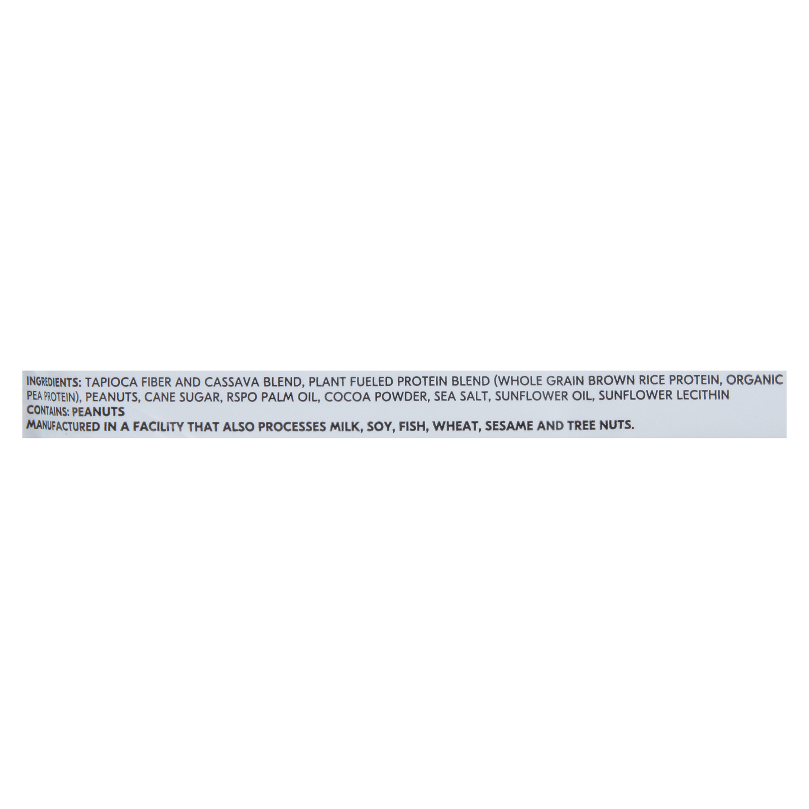 ingredients : tapioca fiber and cassava blend;plant fueled protein blend (whole grain brown rice protein, organic pea protein);peanuts;cane sugar;rspo palm oil;cocoa powder;sea salt;sunflower oil;sunflower lecithin