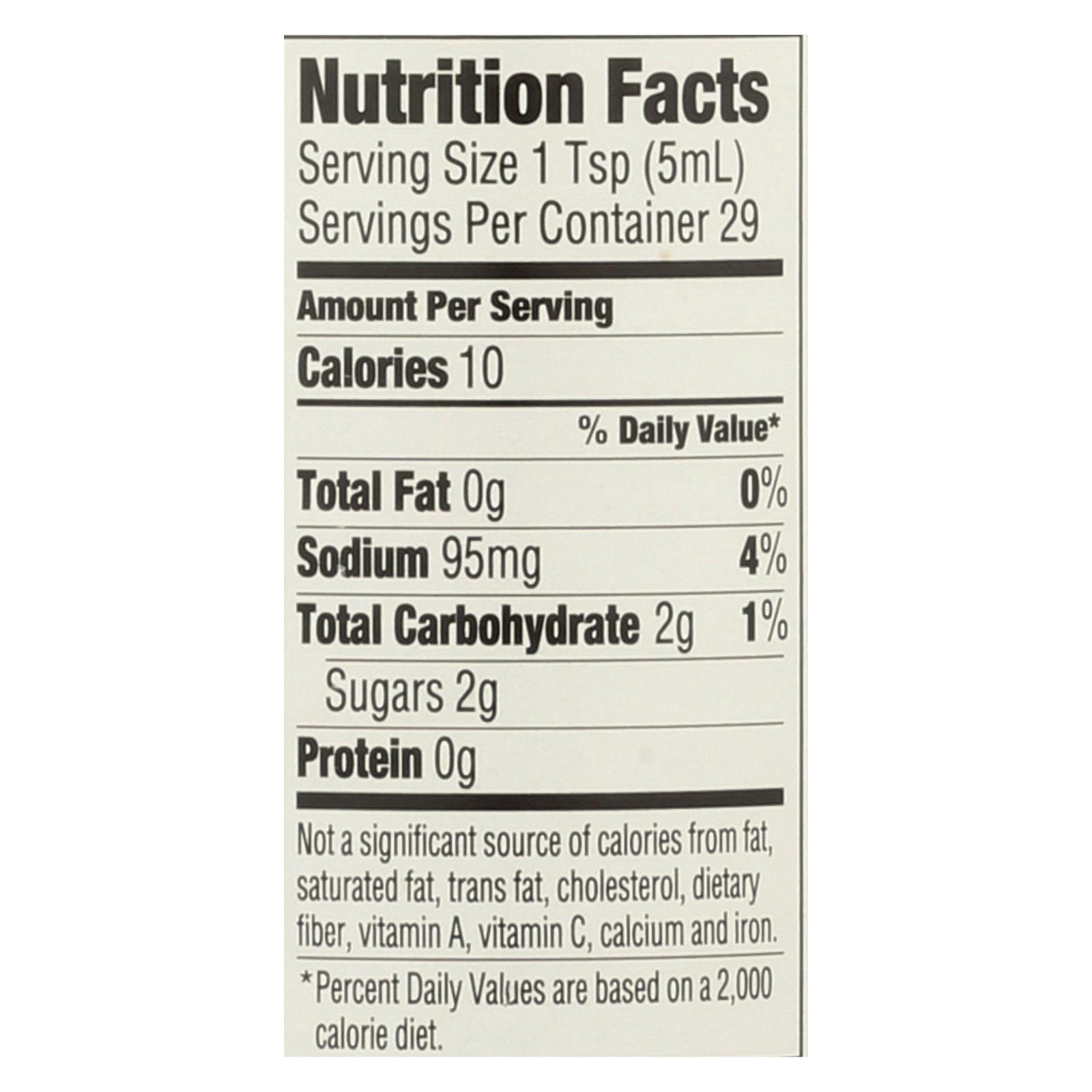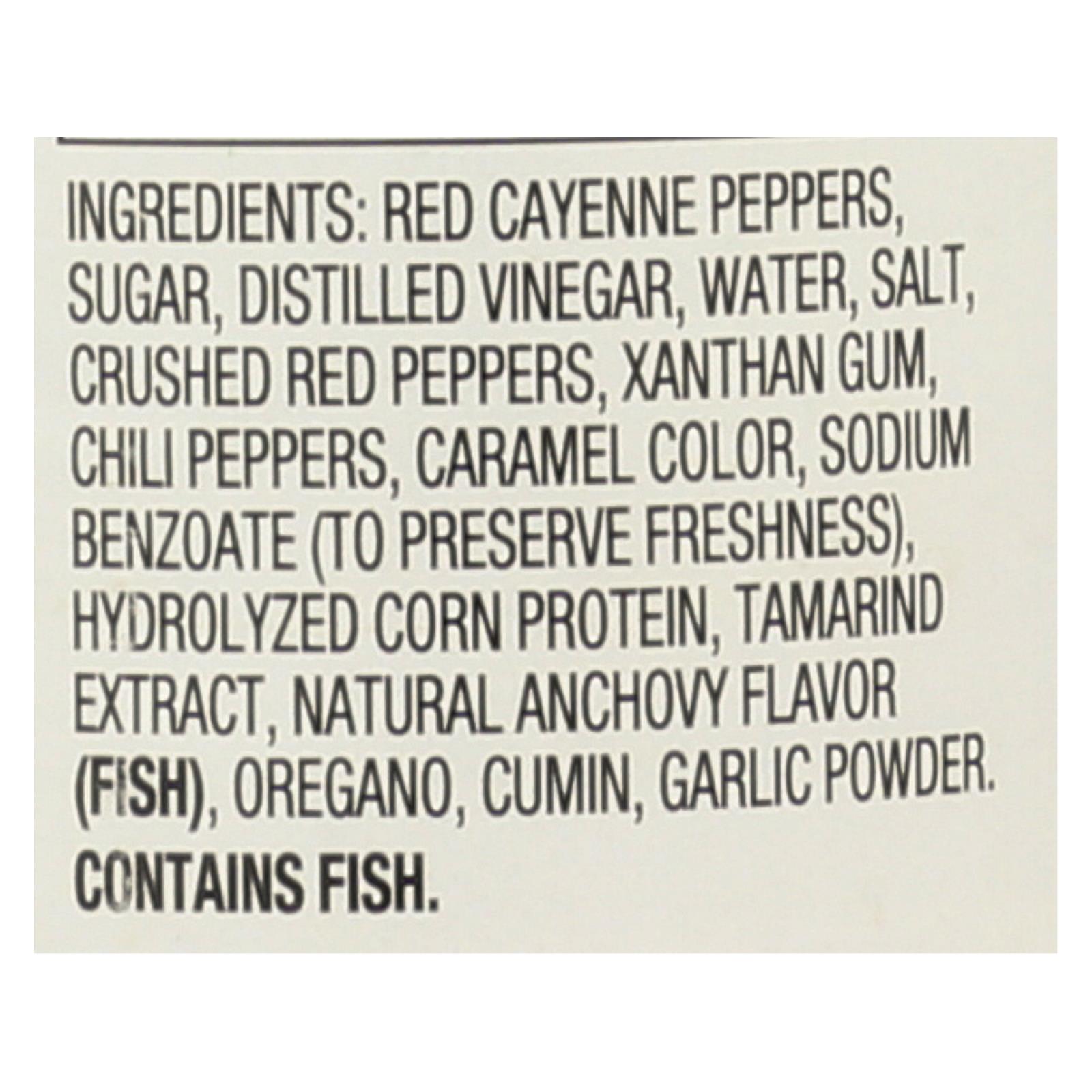 Tryme tiger sauce is partially produced with genetic engineering. This 5 fl. Oz. Container holds twenty-nine 1 tsp. Servings of sauce, with 10 calories and 95 mg. Of sodium per serving. Ingredients include red cayenne peppers, sugar, chili peppers, oregano, cumin and garlic powder. See the nutrition facts panel for allergens.