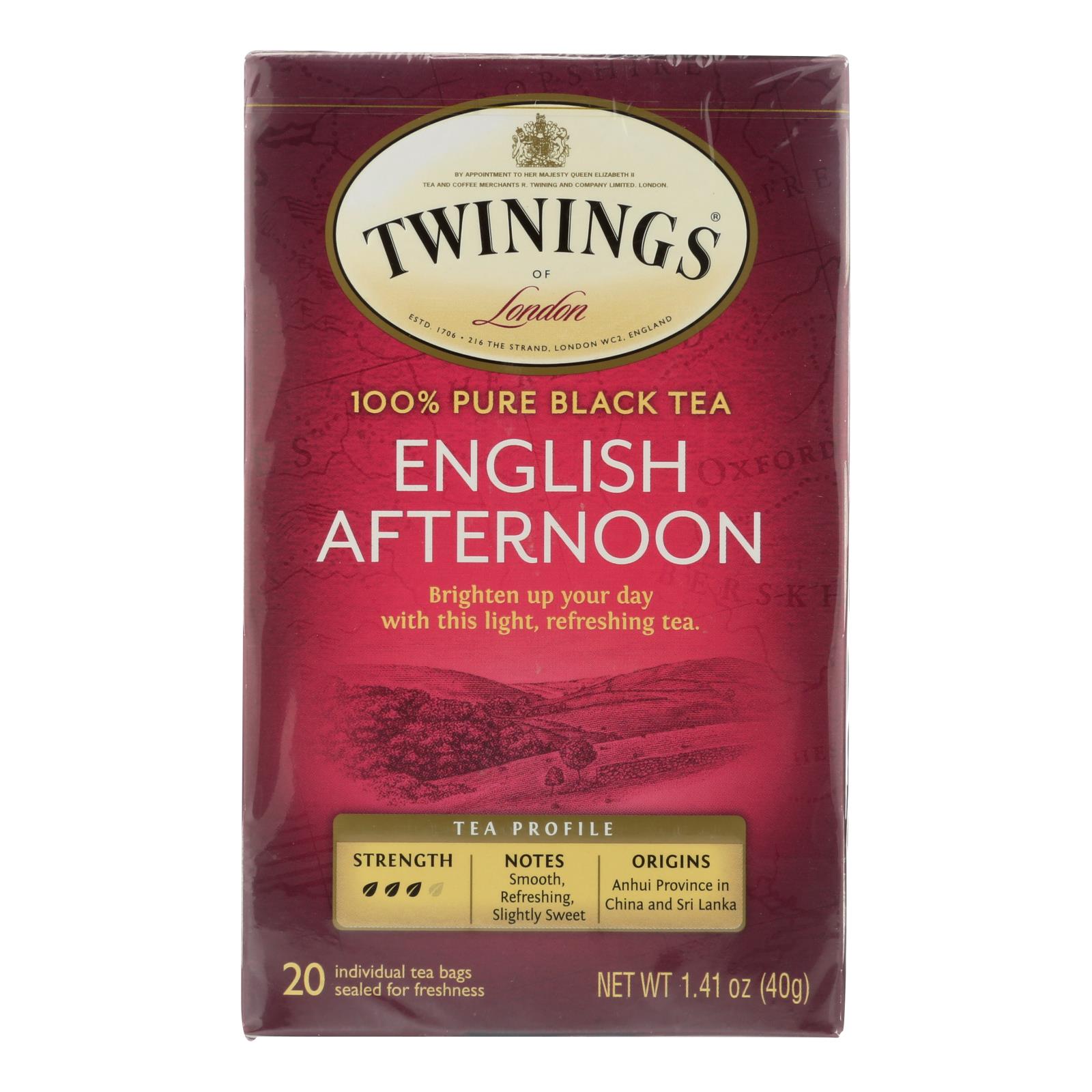 Twinings English Afternoon Black Tea offers a smooth, refreshing blend of Keemun and Ceylon teas in 20 bags per box, sold as a case of 6