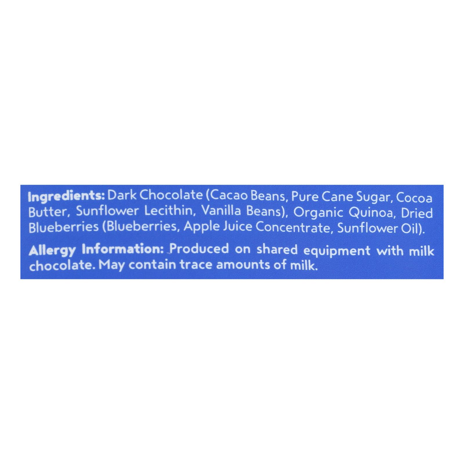 Dark chocolate (cacao beans*, pure cane sugar, cocoa butter*, sunflower lecithin, vanilla beans); quinoa; dried blueberries (blueberries, apple juice concentrate, sunflower oil)