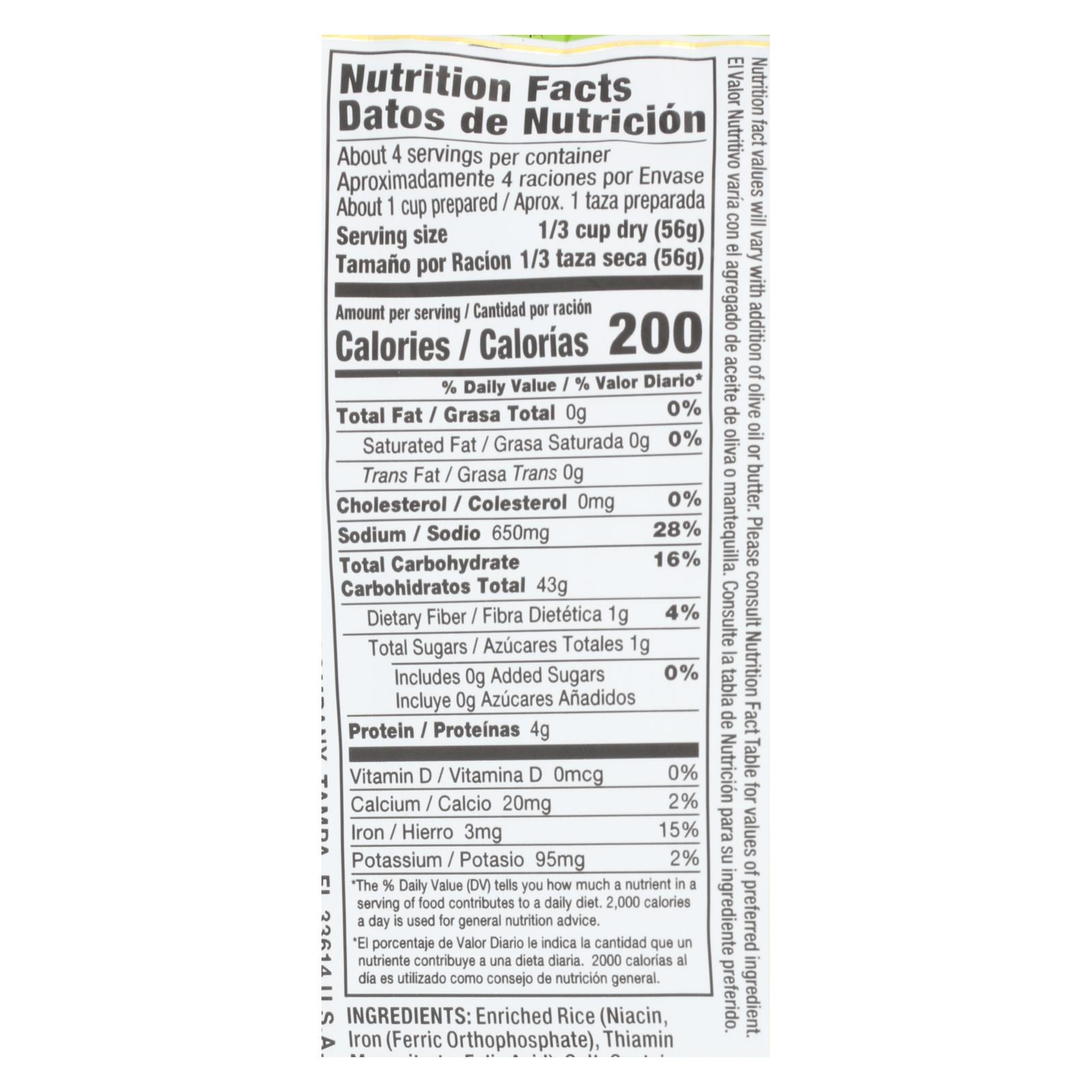 Enriched rice (niacin, iron, ferric orthophosphate, thiamin mononitrate, folic acid), salt. Contains 2% or less of: garlic, granulated onion, lime juice powder, corn meal, cumin, sugar, yeast extract, spinach, maltodextrin (from corn), hydrolyzed corn protein, cilantro, dehydrated chicken, natural flavor, sodium aluminosilicate (to prevent caking), turmeric, parsley, celery extract, pepper.