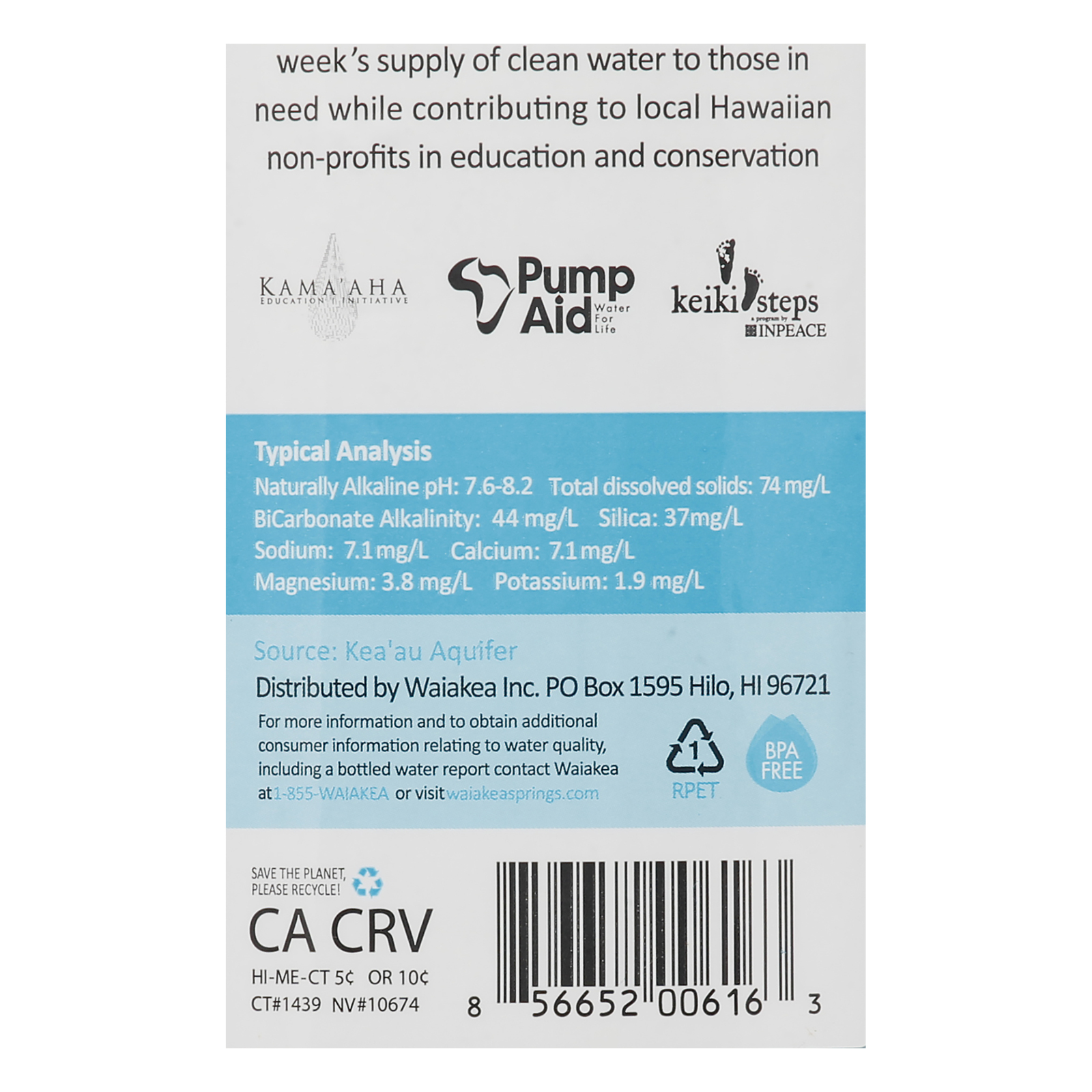 Typical analysis: naturally alkaline ph: 7.6-8.2. Total dissolved solids: 74 mg/l. Bicarbonate alkalinity: 44 mg/l. Silica: 37 mg/l. Sodium: 7.1 mg/l. Calcium: 7.1 mg/l. Magnesium: 3.8 mg/l. Potassium: 1.9 mg/l. Naturally alkaline electrolytes. Deep well water. Premium by nature. Waiakea volcanic water originates in hawai’i through both snowmelt and rain on the pristine summit of the active mauna loa volcano – one of the purest environments on earth. Live healthy: filtered through porous volcanic rock natural electrolytes and minerals naturally alkaline. Live sustainably: 393 mill gal/day source sustainable yield 100% post recycled eco-bottle certified carbonneutral. Live ethically: for every liter you buy, waiakea provides a week’s supply of clean water to those in need while contributing to local hawaiian non-profits in education and conservation. Kama’aha education initiative. Pump aid water for life. Keiki steps a program by inpeace. Source: kea’au aquifer. Waiakeasprings.com. For more information and to obtain additional consumer information relating to water quality, including a bottled water report contact waiakea at 1-855-waiakea or visit waiakeasprings.com. Bpa free. Save the planet please recycle.