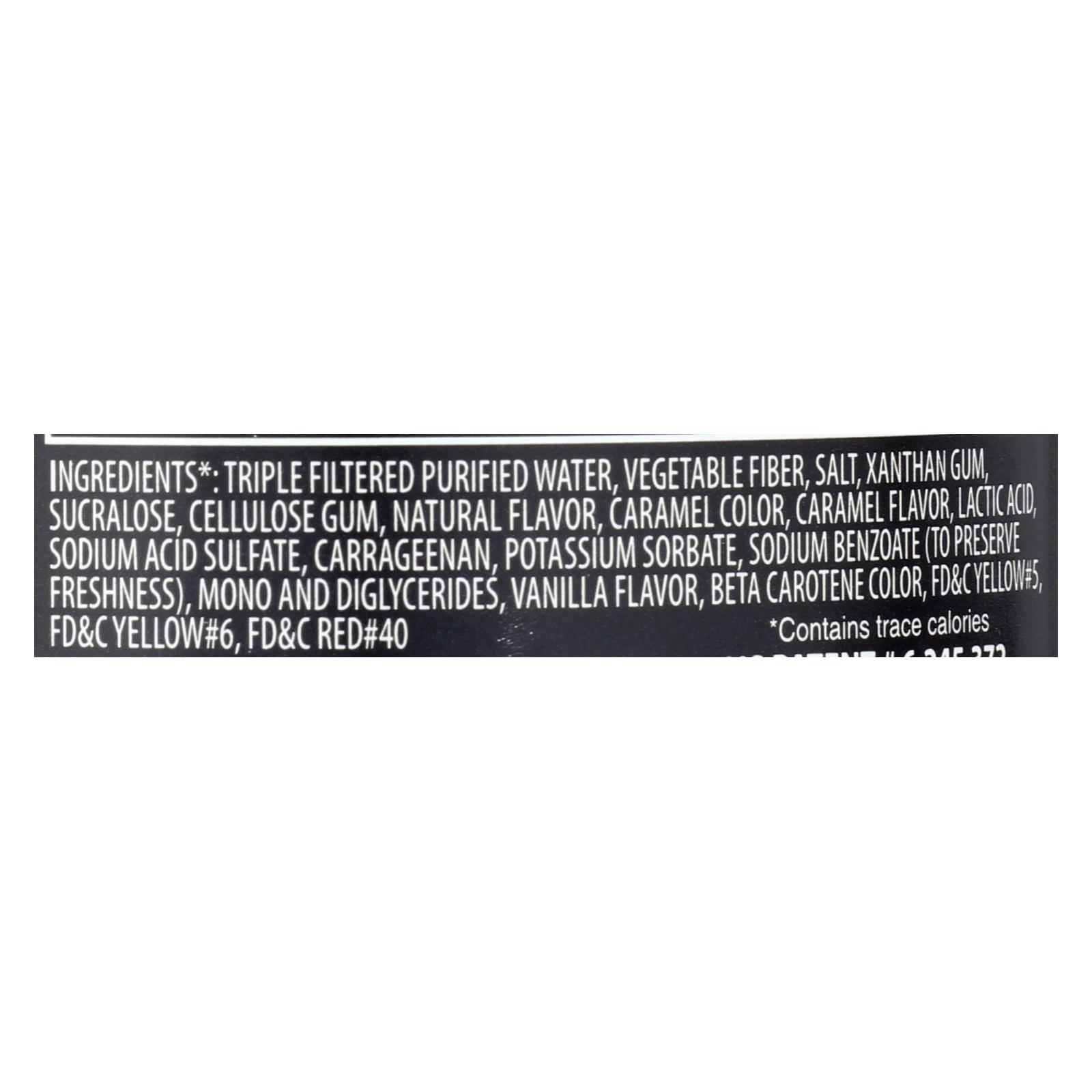 Water, corn fiber, erythritol, xanthan gum, microcrystalline cellulose, propylene glycol alginate, natural flavor, caramel color, salt, sodium citrate, stevia leaf extract, gellan gum, beta carotene (for color).