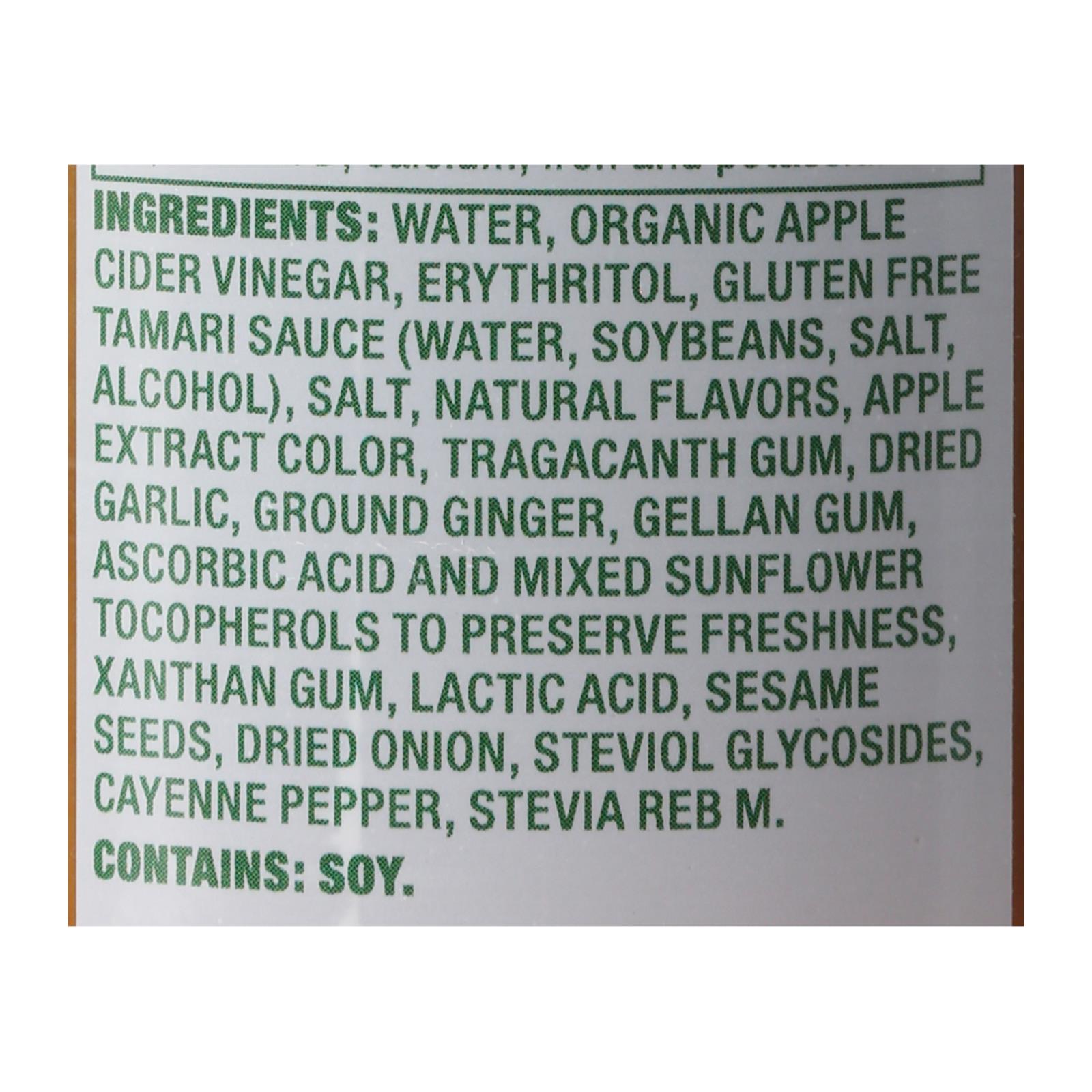 Water, organic apple cider vinegar, erythritol, gluten free tamari sauce (water, soybeans, salt, alcohol), salt, natural flavors, apple extract color, tragacanth gum, dried garlic, ground ginger, gellan gum, ascorbic acid and mixed sunflower tocopherols to preserve freshness, xanthan gum, lactic acid, sesame seeds, dried onion, steviol glycosides, cayenne pepper, stevia reb m.
