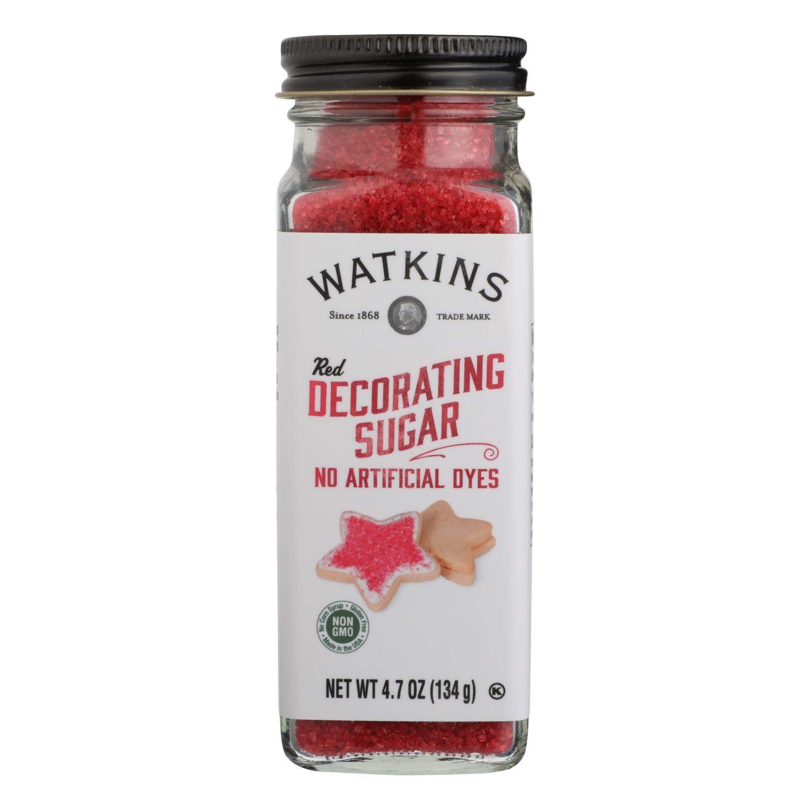 Since 1868. Watkins red decorating sugar is made with natural colorings. Our vibrant sugar are free from artificial dyes and colors, continuing the watkins tradition of excellence. Superior quality backed by america’s first documented money back guarantee – since 1868. No artificial dyes. Non gmo: no corn syrup; gluten free. Visit us at watkins1868.com. Please recycle. Made in the usa.