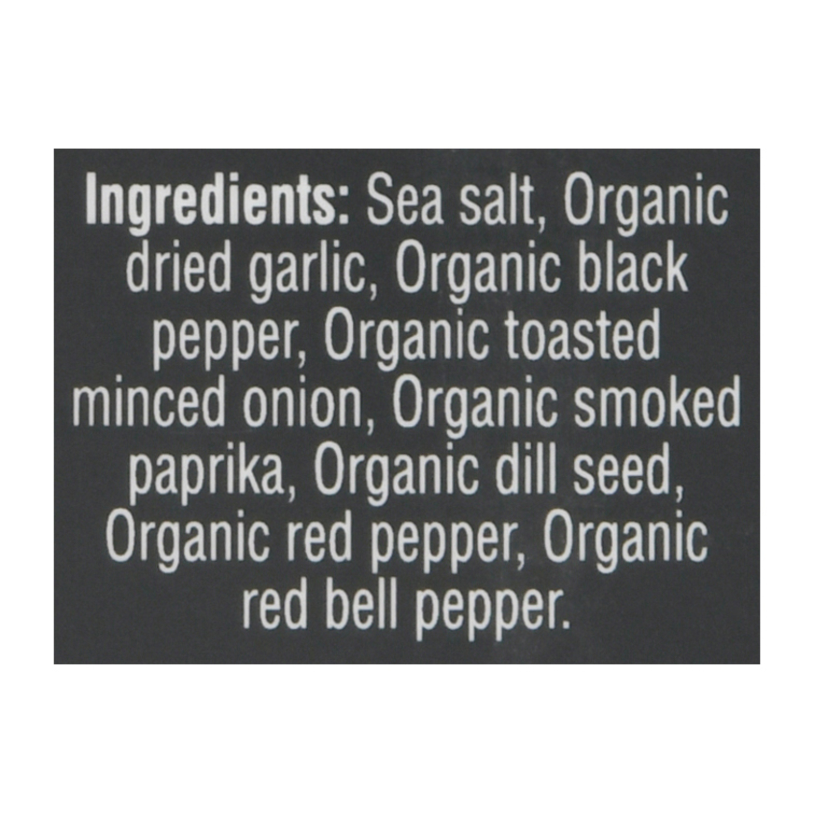 Sea salt, organic dried garlic, organic black pepper, organic toasted minced onion, organic smoked paprika, organic dill seed, organic red pepper, organic red bell pepper.