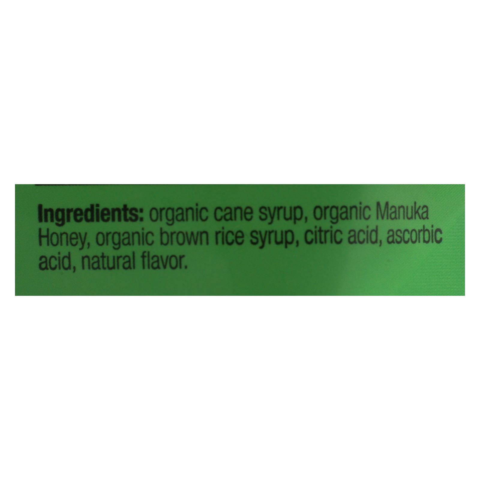 ingredients : organic cane syrup;organic manuka honey;organic brown rice syrup;citric acid;ascorbic acid;natural flavor