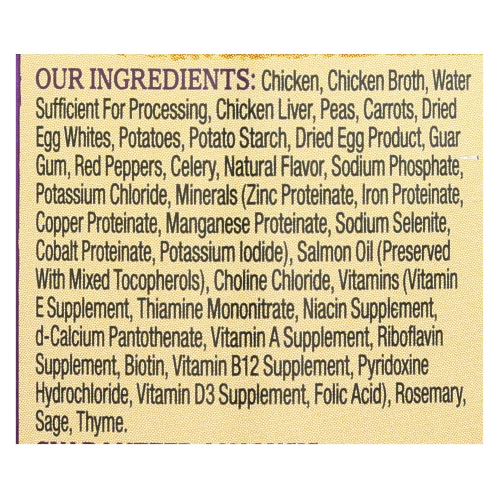 Chicken, chicken broth, water sufficient for processing, chicken liver, peas, carrots, dried egg whites, potatoes, potato starch, dried egg product, guar gum, red peppers, celery, natural flavor, sodium phosphate, potassium chloride, minerals, zinc proteinate, iron proteinate, copper proteinate, manganese proteinate, sodium selenite, cobalt proteinate, potassium iodide, salmon oil, preserved with mixed tocopherols, choline chloride, vitamins, vitamin E supplement, thiamine mononitrate, niacin supplement, d-calcium pantothenate.