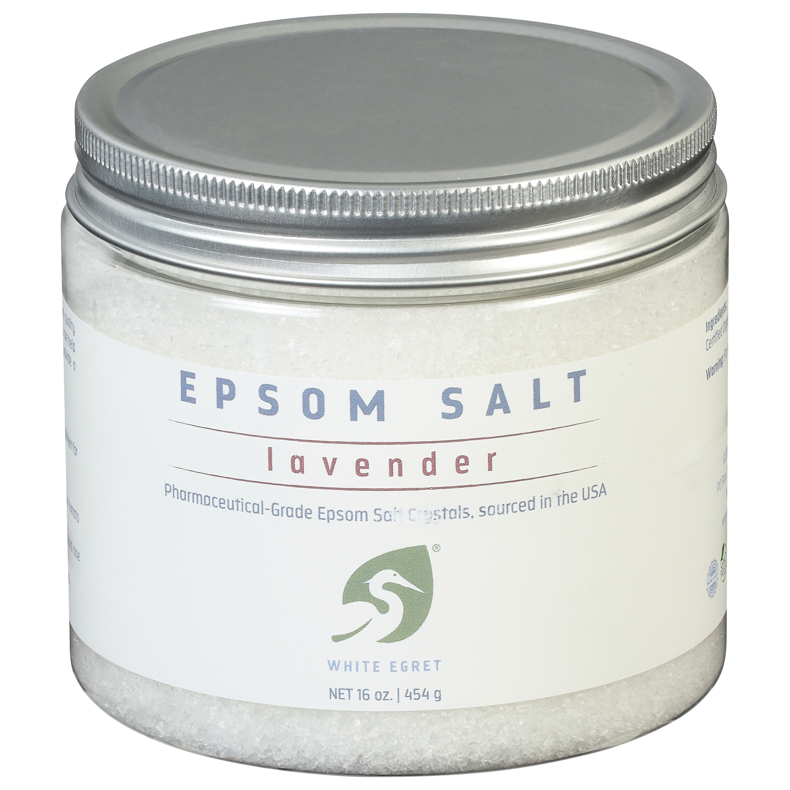 White Egret Epsom Salt Lavender, 16 oz, offers a soothing, gluten-free soak that softens skin and eases aches with premium crystals from the USA