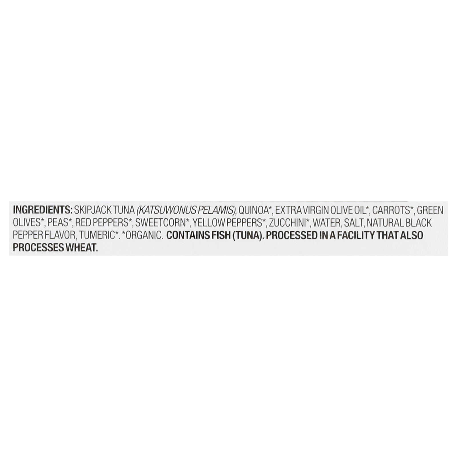 Skipjack tuna (Katsuwonus pelamis), quinoa, extra virgin olive oil, carrots, green olives, peas, red peppers, sweetcorn, yellow peppers, zucchini, water, salt, natural black pepper flavor, turmeric.