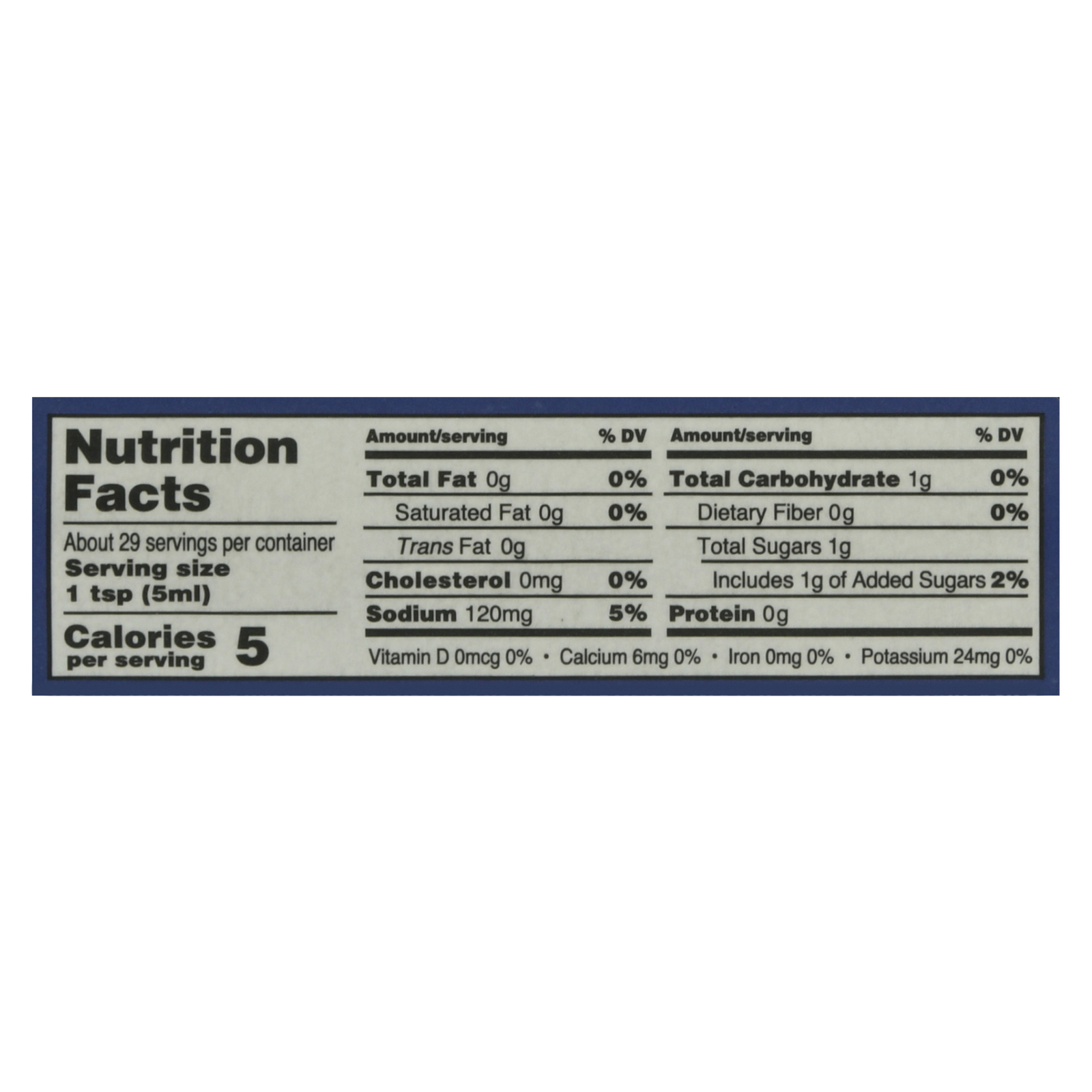 - Serving size: Not specified; 5 fl. oz. bottle yields about 29 servings