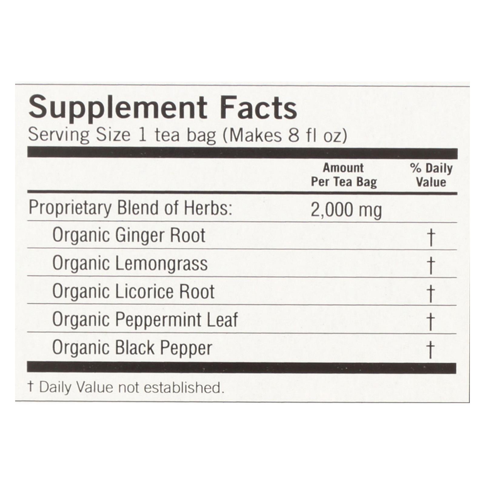Organic ginger root, organic licorice root, organic peppermint leaf, organic lemongrass, and other organic botanicals.