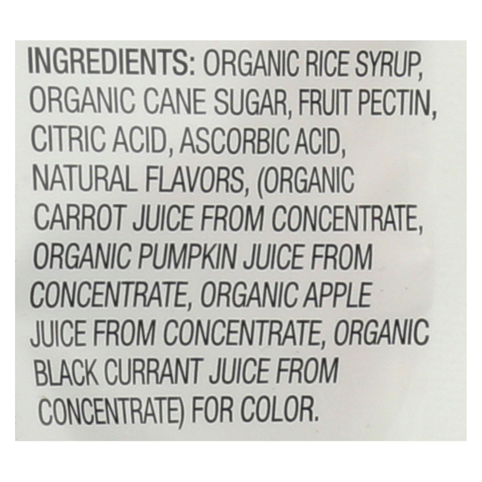 Organic rice syrup, organic cane sugar, fruit pectin, citric acid, ascorbic acid, natural flavors, organic carrot juice from concentrate, organic pumpkin juice from concentrate, organic apple juice from concentrate, organic black currant juice from concentrate (for color).