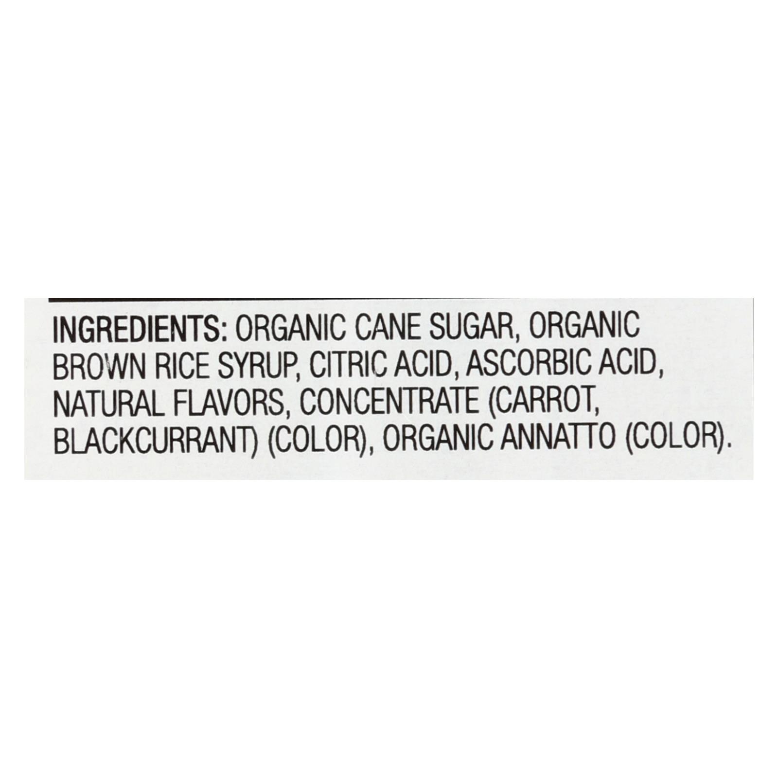 ingredients : organic cane sugar;organic brown rice syrup;citric acid;ascorbic acid;natural flavors;concentrate;carrot;blackcurrant;color;organic annatto